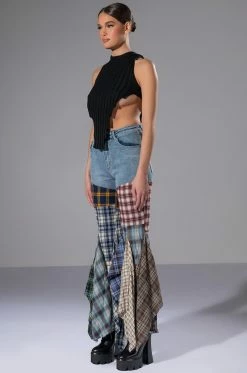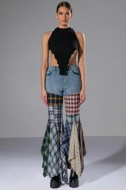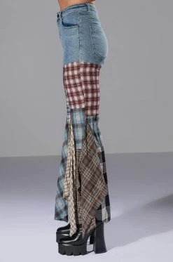 The AKIRA Label Alexa Plaid Patchwork Flared Jeans are made from a mixed fabrication and feature a washed denim fabrication top with a high rise waist, working belt loops, and a five-pocket design. Complete with colorblock plaid flannel patchwork flared legs with distressed plaid flannel tissue detailing.