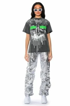 The AKIRA Label Alphabet City Oversized Graphic Tshirt in White is made from a stretchy cotton fabrication and features a crew neckline, short sleeves, and a boxy, oversized silhouette. Complete with mirror gem lettering in front. Style this glitzy piece with anything from your favorite kicks to booties to make a sparkling statement!