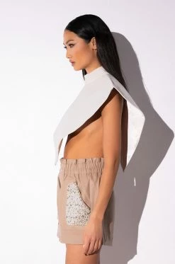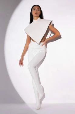 The AKIRA Label Faux Leather Mock Neck Triangle Blouse is a chic, structured capelet blouse complete with a mock neckline, a vegan leather base, a triangular silhouette, and a cropped cut. This circular style lays over the arms. Pair with knit midi dresses and knee high boots.