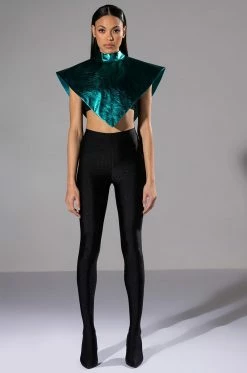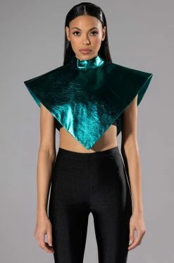 The AKIRA Label Metallic Faux Leather Mock Neck Triangle Blouse is a chic, structured capelet blouse complete with a mock neckline, a metallic vegan leather base, a triangular silhouette, and a cropped cut. Complete with a tonal back zipper closure. This circular style lays over the arms. Pair with knit midi dresses and knee high boots.