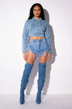 The AKIRA Label Big Energy Feather Jean Short is a fresh denim piece featuring real feather fringe, a high rise waist, a five pocket design, working belt loops, a cheeky high cut silhouette, and a classic button and zipper closure.