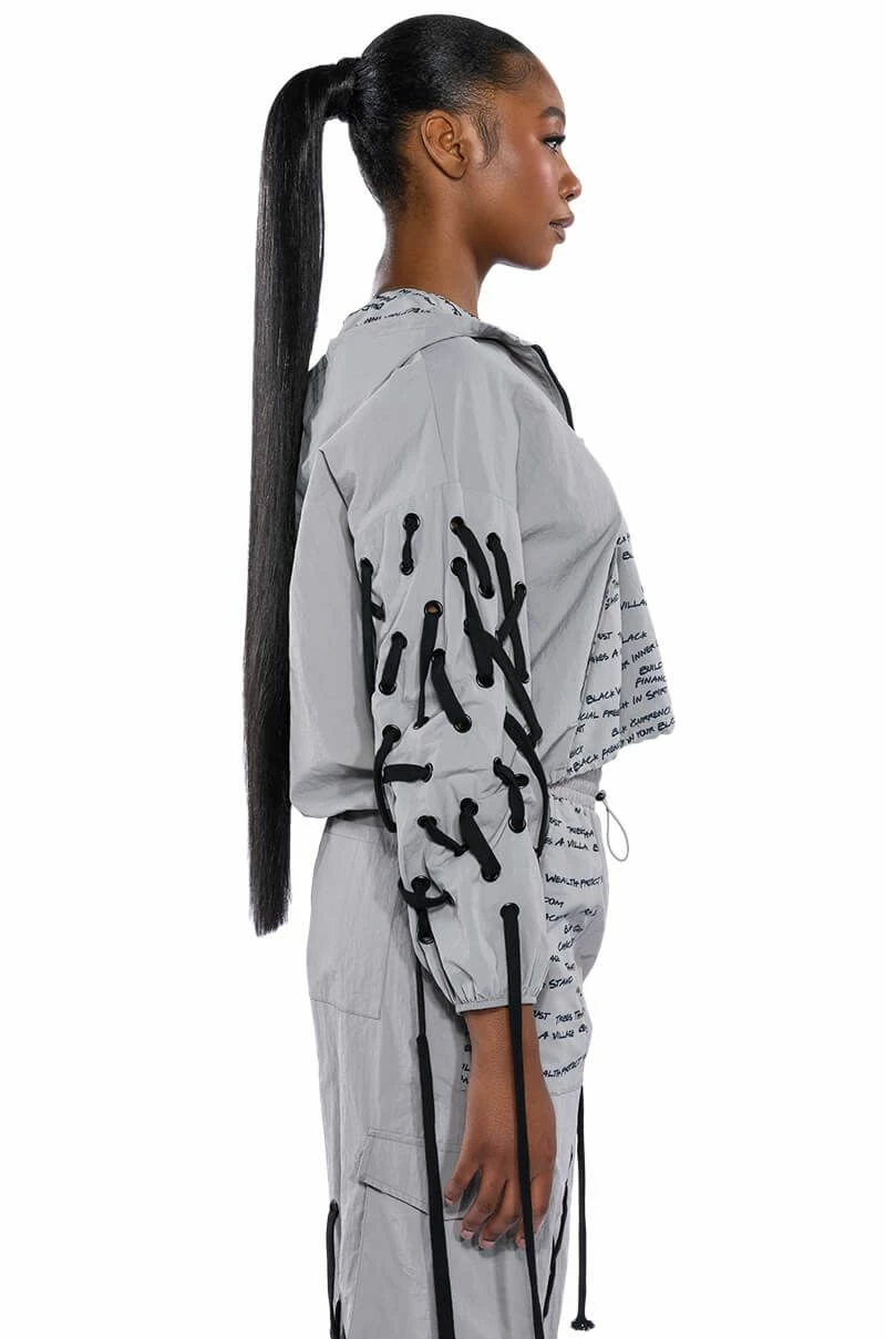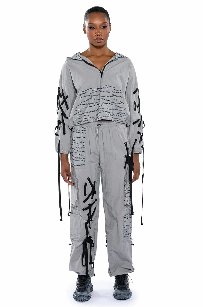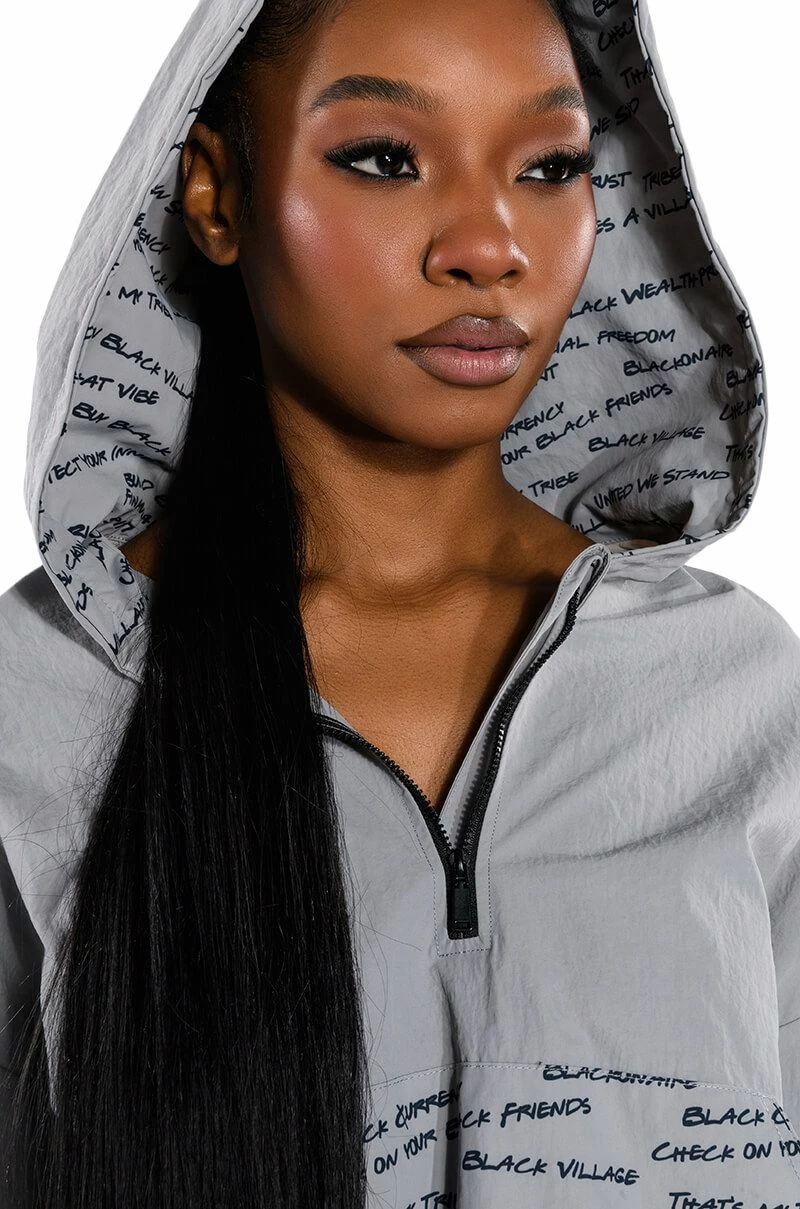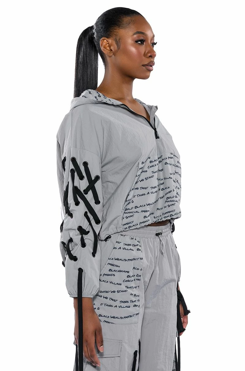 The AKIRA Label Black Village Foundation Logo Lace Up Detail Cropped Hoodie lightweight nylon windbreaker fabrication, an attached hood, long elastic cinched sleeves, lace up sleeve detailing, a quarter zip front closure, and a slightly cropped cut. Complete with dual adjustable drawstring toggle closures for an adjustable cinched hem, and a text print cargo pocket. Complete with a front zipper closure. The graphic text patterning, designed by activist, “Empire” star, and BVF co-founder Ta’Rhonda Jones, represents BVF’s founding principles and ideals. Text print patterning displays the phrases: