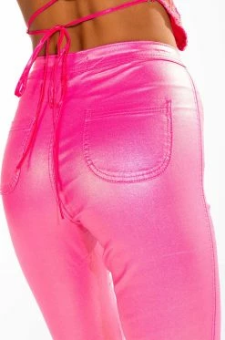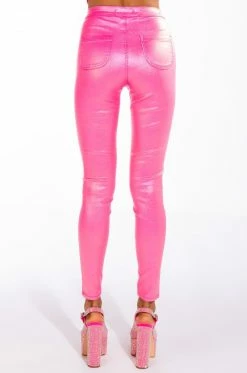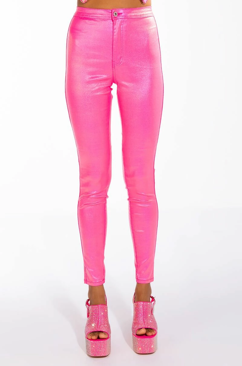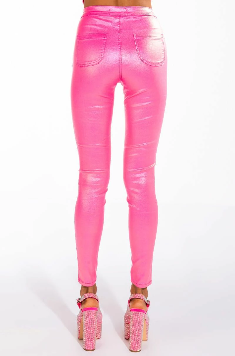 Consider the spotlight officially stolen. Stand out for all the right reasons in The AKIRA Label Born To Shine Metallic Skinny Pants. These glittery, structured yet stretchy bottoms feature a high rise waist, working back pockets, a skinny leg silhouette, and a front button and zipper closure.