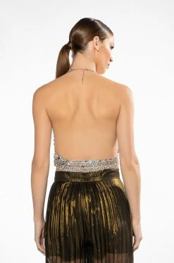 The AKIRA Label Breathtaking Rhinestone Bra Top is a rhinestone link bra top complete with a halter neck design, a glamorous rhinestone link design, a cropped bra top design, back strap fastening, and a back strap. Complete with dual lobster claw closures.