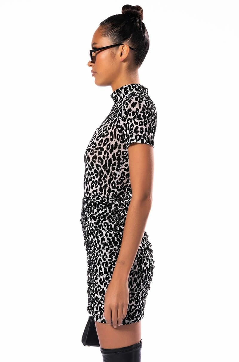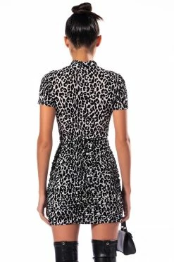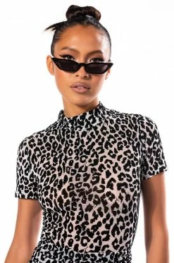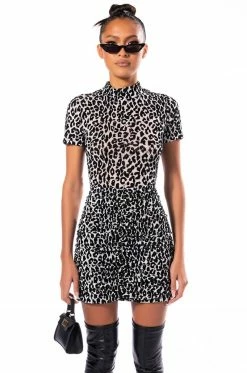 Free your mind, the rest will follow. The AKIRA Label Cant Be Tamed Short Sleeve Mock Neck Bodysuit features a sheer mesh base, velvet burnout leopard print patterning, a mock neckline, short sleeves, an attached thong button, and a snap gusset closure. Pair with the coordinating AKIRA Label Cant Be Tamed Mini Skirt for a complete look.