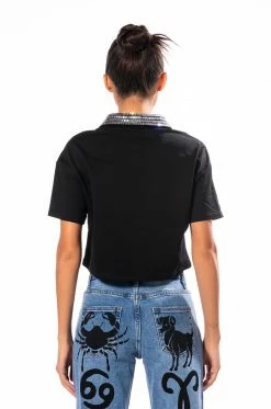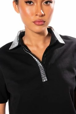 Game over! The AKIRA Label Check Mate Rhinestone Collar Polo Tshirt is made from crisp cotton and is complete with short sleeves, a collared neckline with rhinestone trim, five front button details, and a cropped length. Pair this piece with trousers to dress it up or leggings to keep it casual.