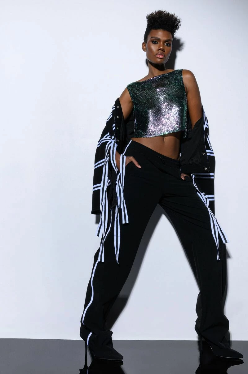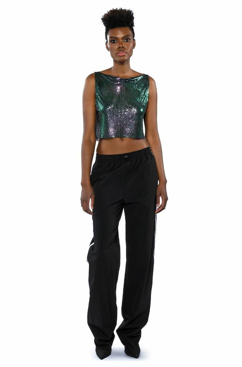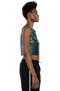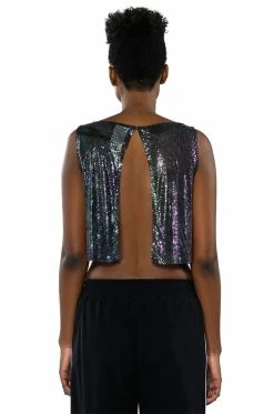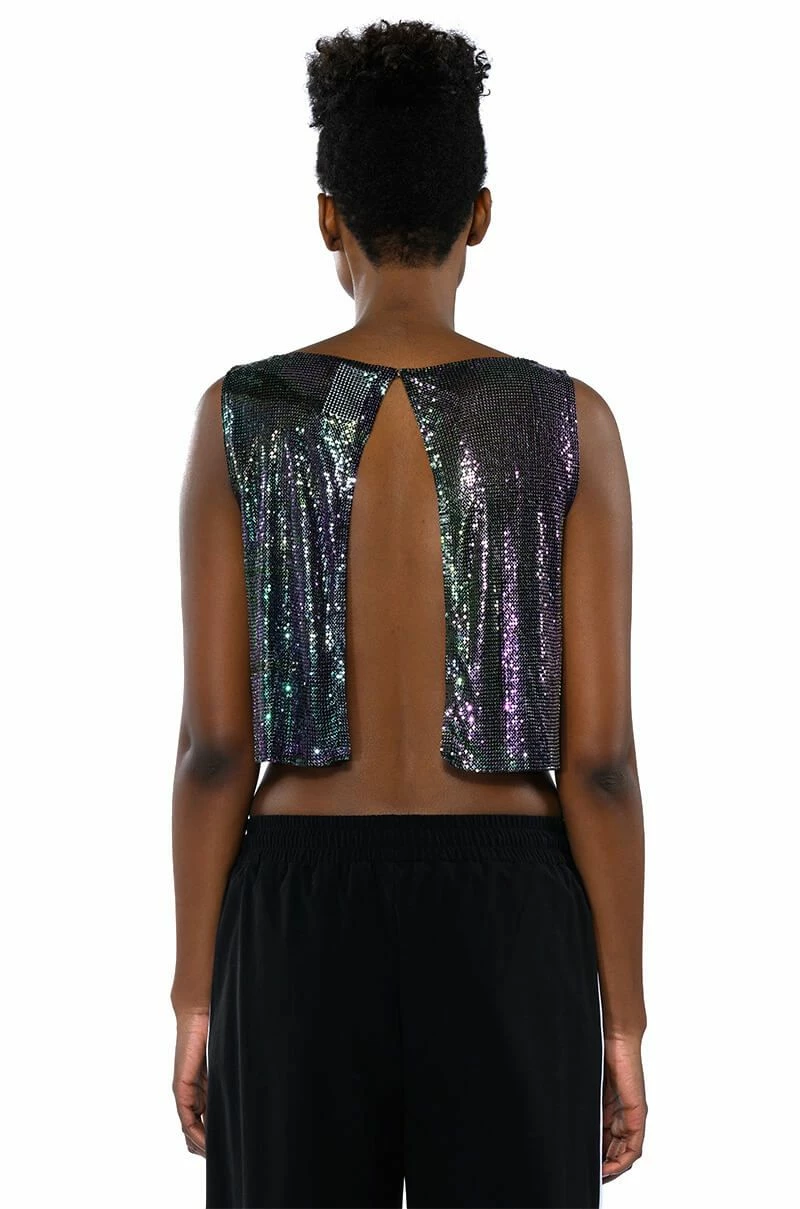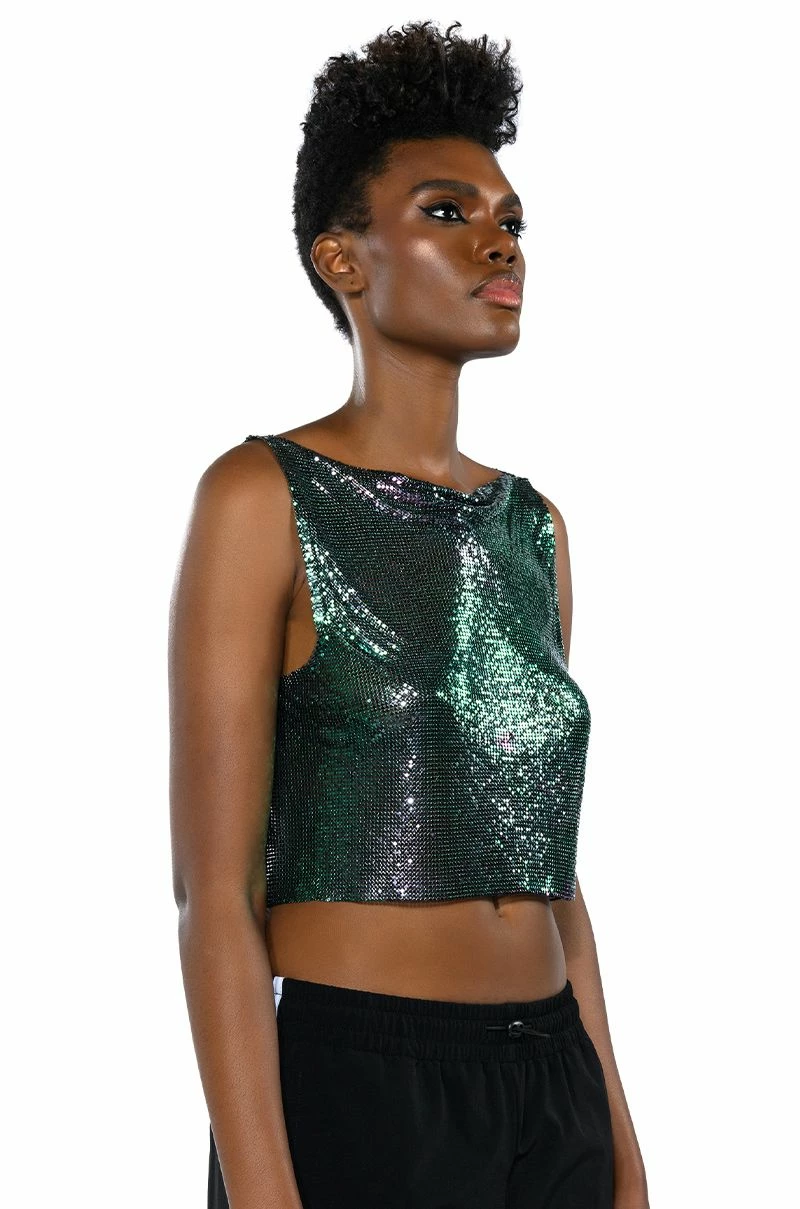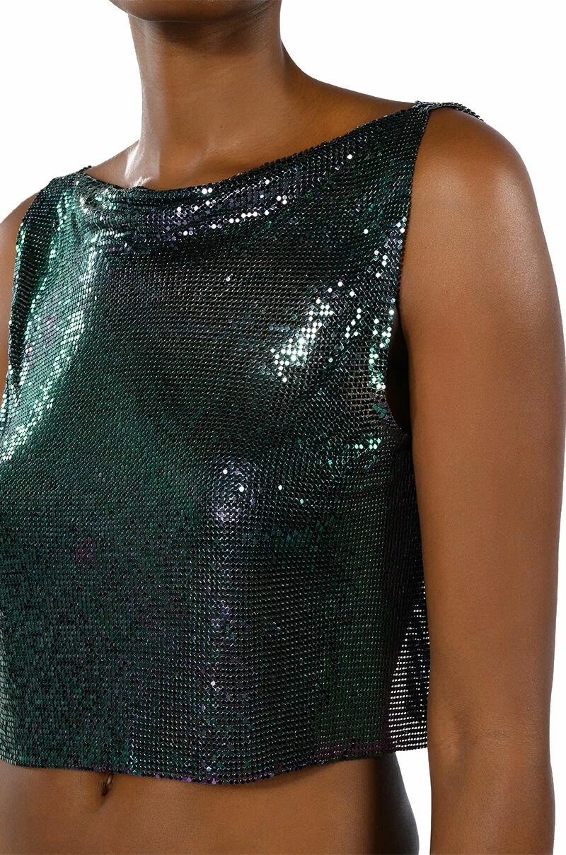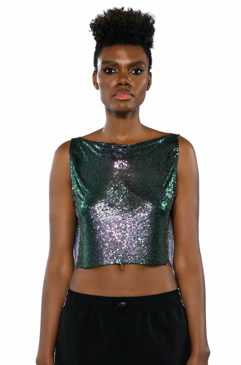 The AKIRA Label Come My Way High Shine Chainmail Tank Top is made from an iridescent chainmail base and features a draped neckline, tank straps, a boxy design, a cropped silhouette, a sexy open back with a hook and eye top closure. Pair this glimmering piece with wide leg bottoms and platform sandals to complete your entrancing look.