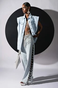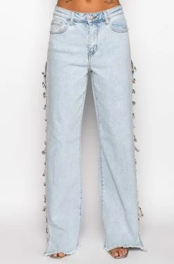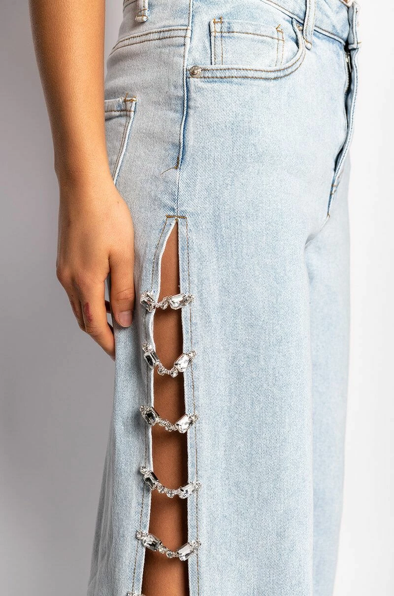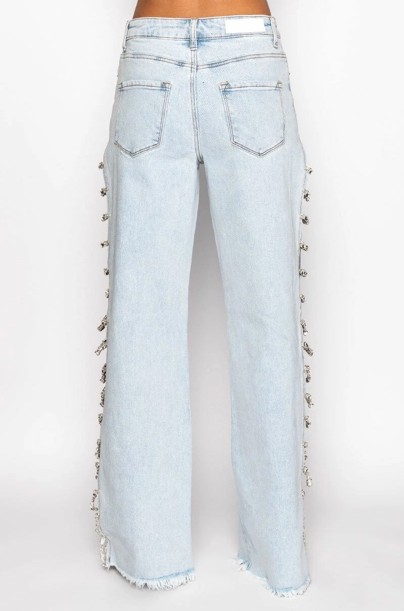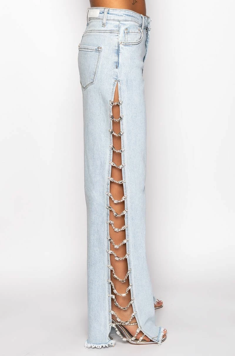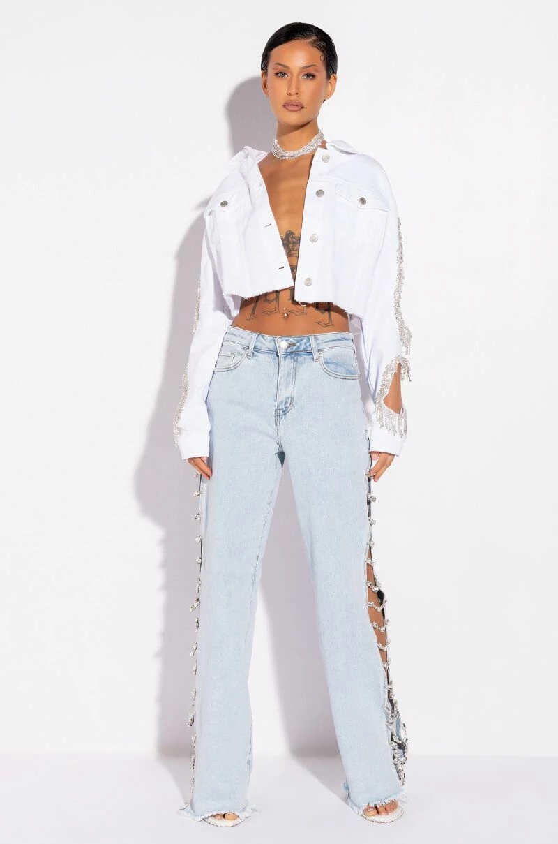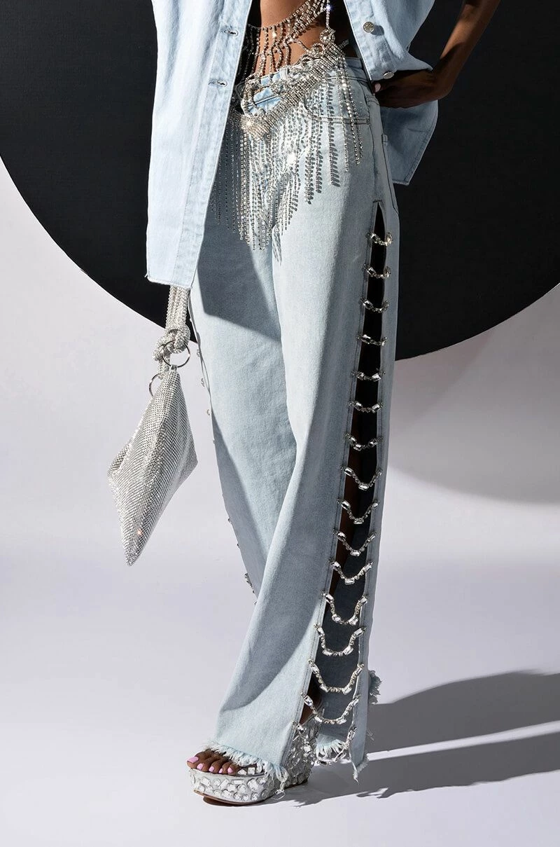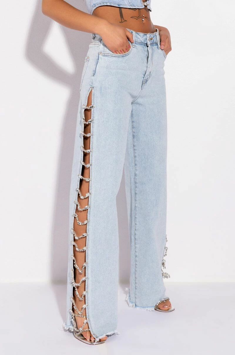 The AKIRA Label Covered In Diamonds Relaxed Jeans are made from a washed denim fabrication and feature a high rise waist, belt loops, a classic five-pocket design, relaxed pant legs, long, sexy side slits with rhinestone gem link detailing, fringe hems, and a button and zipper closure.