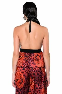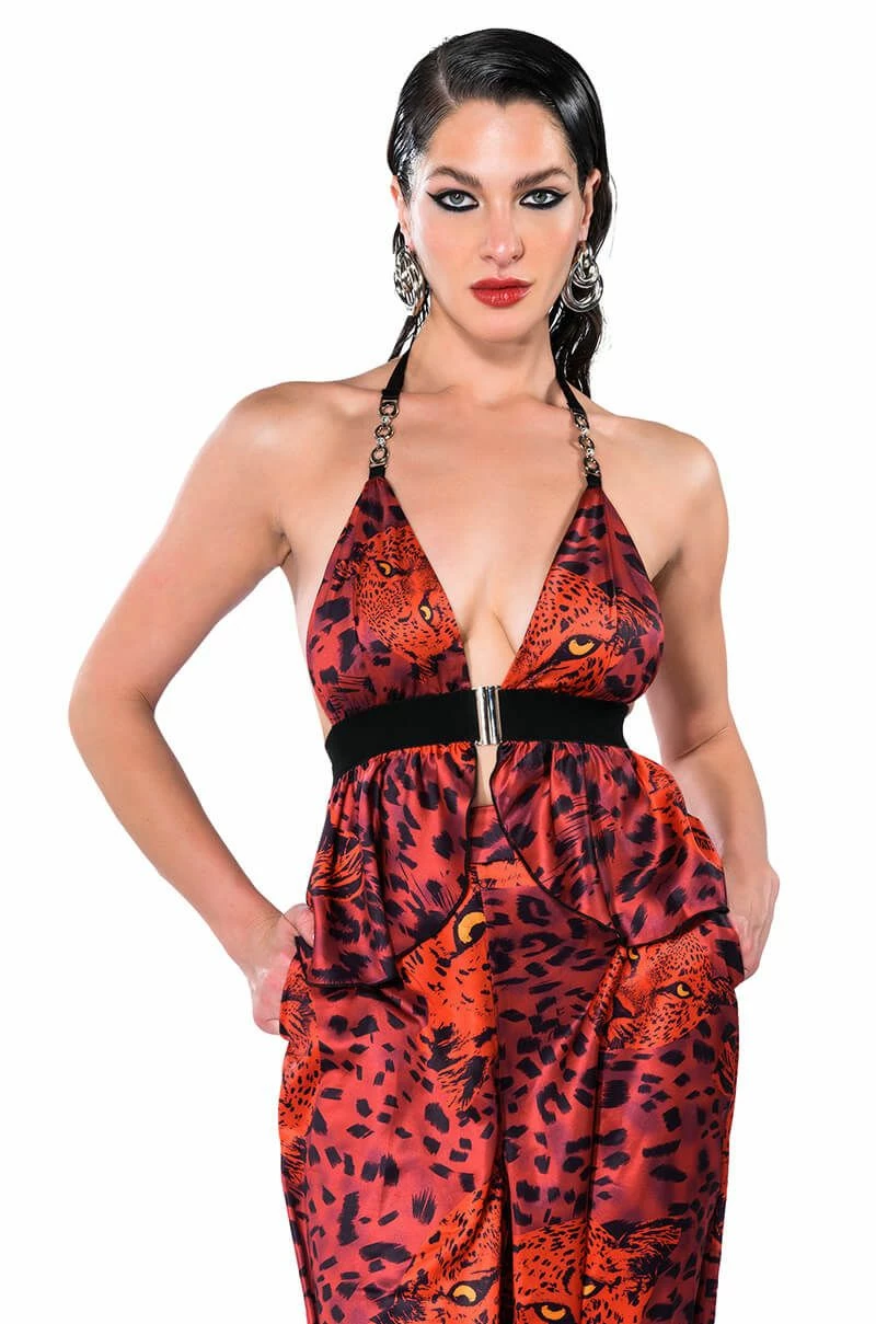 The AKIRA Label Craving Your Attention Halter Top is made from a soft satin fabrication and features a fierce cheetah print with floating cheetah heads, a tie halter with embellished chain detailing, a plunging neckline, a wide, buckled elastic waistband, a sexy open back, and a rounded, peplum-like hem. Pair this piece with the matching AKIRA Label Craving Your Attention Wide Leg Pants to keep all eyes on you.