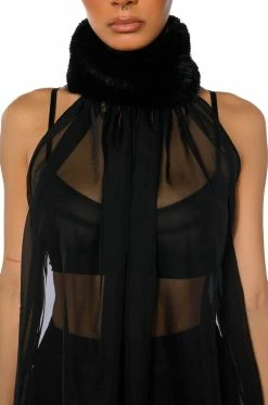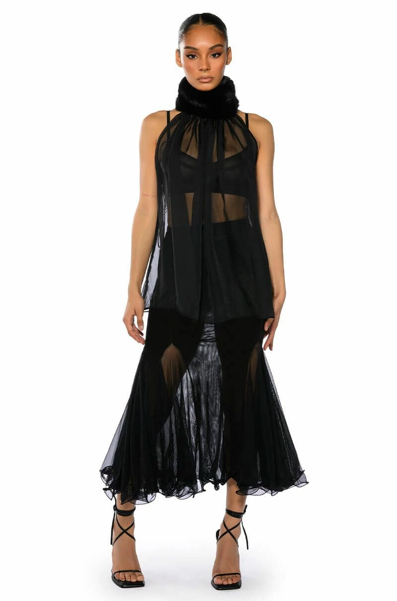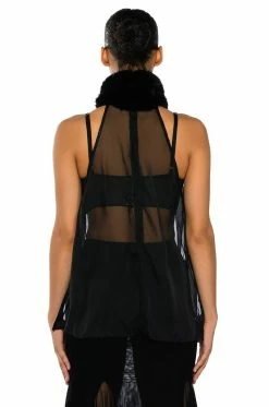The AKIRA Label Elegant Faux Fur Turtleneck Tank Blouse features a sheer chiffon base, a faux fur turtleneck collar, a longline silhouette, and a sleeveless design. Complete with a concealed tonal back zipper closure. Pair with wide leg trousers and pointy toe pumps.