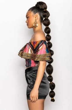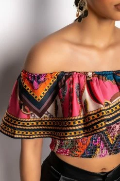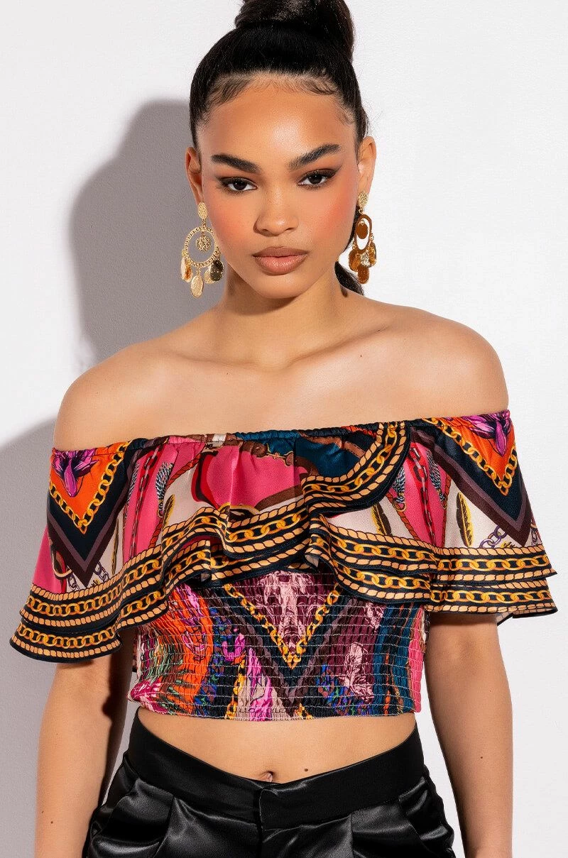 The AKIRA Label Excuse Me Off The Shoulders Blouse is made from a slick satin fabrication and features a multicolor vintage-inspired scarf print, an elastic off the shoulder neckline with tiered ruffle detailing, and a shirred elastic body. Pair this piece with the matching AKIRA Label Excuse Me Tie Front Wide Leg Palazzo Pants to finish off your chic, colorful look!