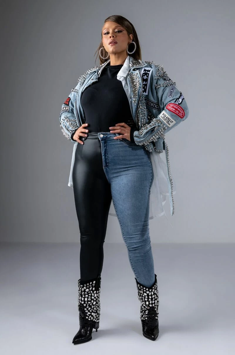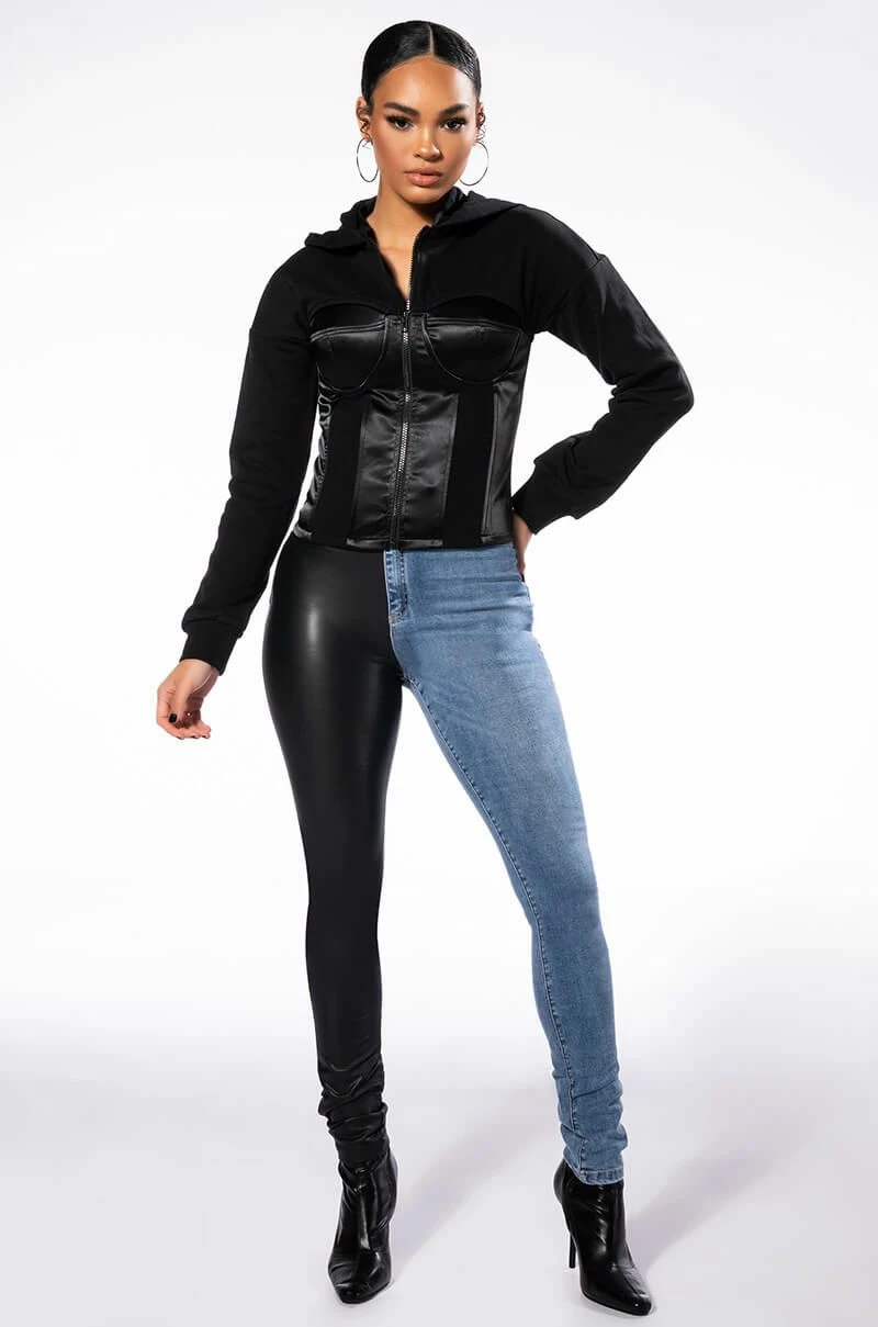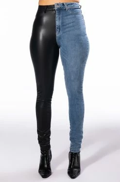 You get the best of both worlds with The AKIRA Label Flex Fit Extreme Stretch Half And Half PU High Waist Skinny Jean! These ultra-stretchy denim bottoms feature a super stretchy curve-hugging stretch denim knit construction, a high rise waist, a faux leather leg and back pocket, a classic zip button closure, and a skinny leg fit complete with functioning belt loops. Style with your fave graphic crop tops and sleek ankle booties for a casual moment that puts your sexy self front and center.