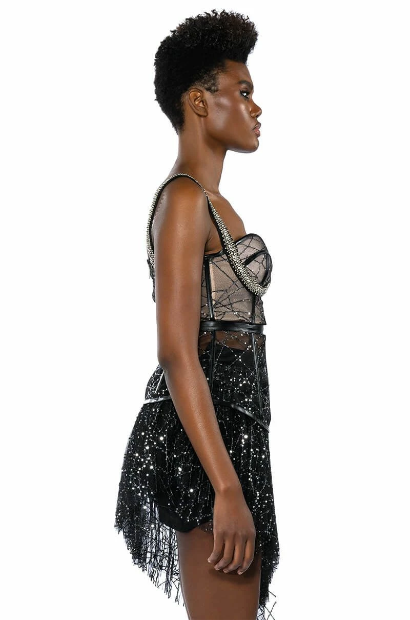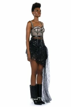 The AKIRA Label Feya Embellished Corset is made from a sheer, sequin-detailed mesh fabrication and features rhinestone and bead-embellished tank straps that circle around the chest, a sweetheart neckline, padded cups, faux leather corset piping, boning for structure, a slight peplum hem, a shirred elastic back panel, and an exposed back zipper closure. Pair this piece with the coordinating AKIRA Label Feya High Low Tulle Layered Mini Skirt to complete your dramatic look.