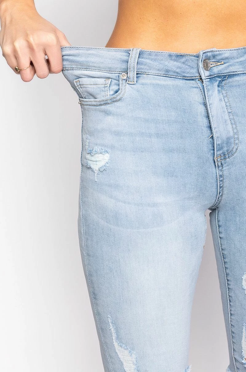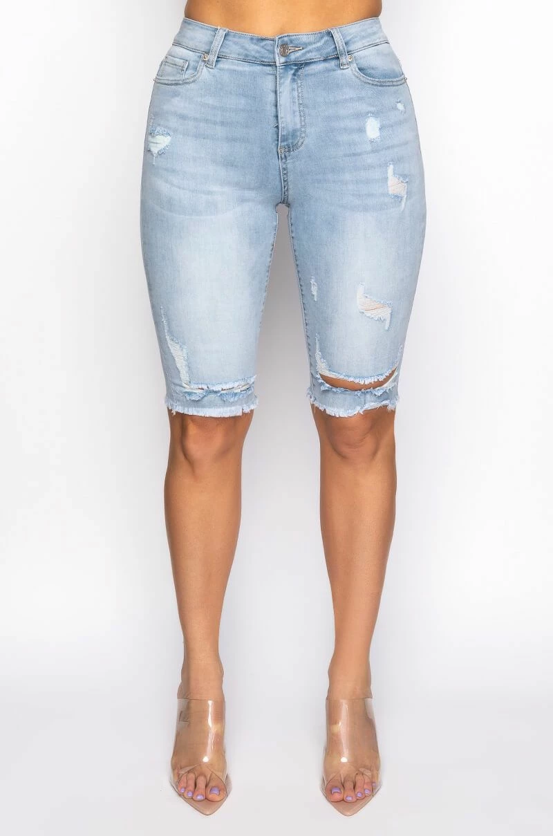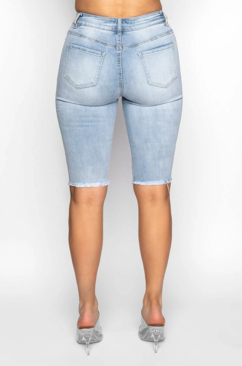 Snatch your waist and show off that booty with The AKIRA Label Flex Fit Extreme Stretch Distressed Bermuda Shorts. These ultra-stretchy denim bottoms feature a curve-hugging construction, a high rise waist, a classic zip button closure, distressed detailing, a knee length silhouette, and raw hemline. Complete with a functional five pocket design, working belt loops, and silver metallic hardware.