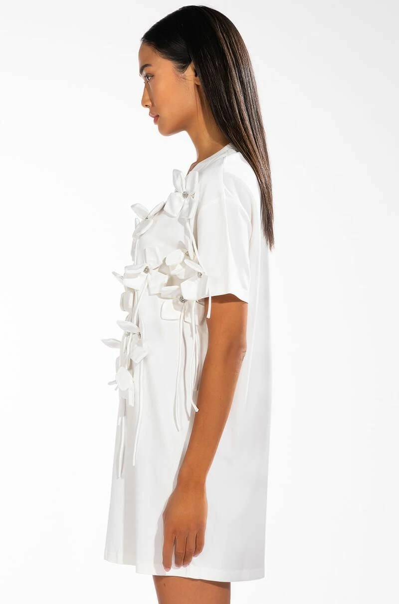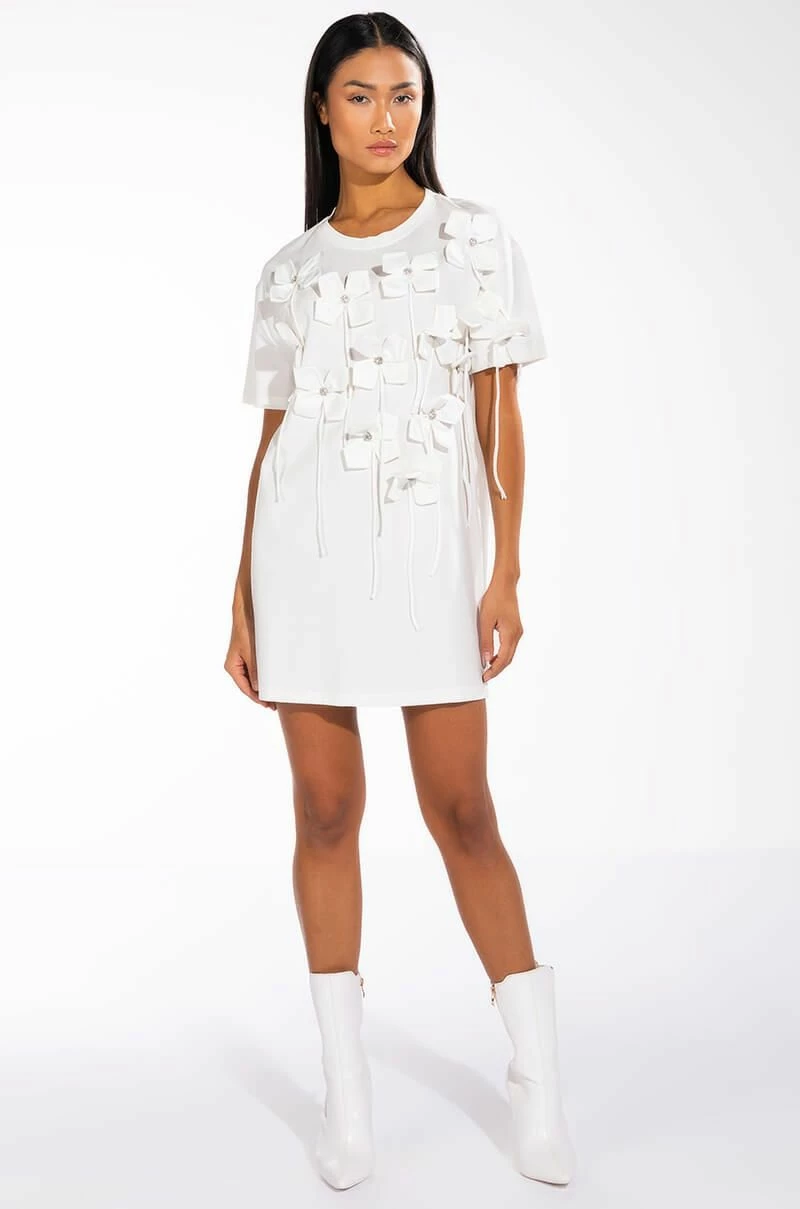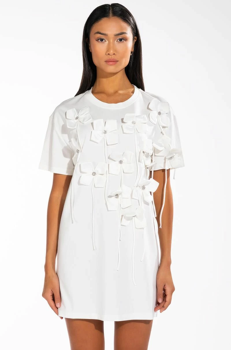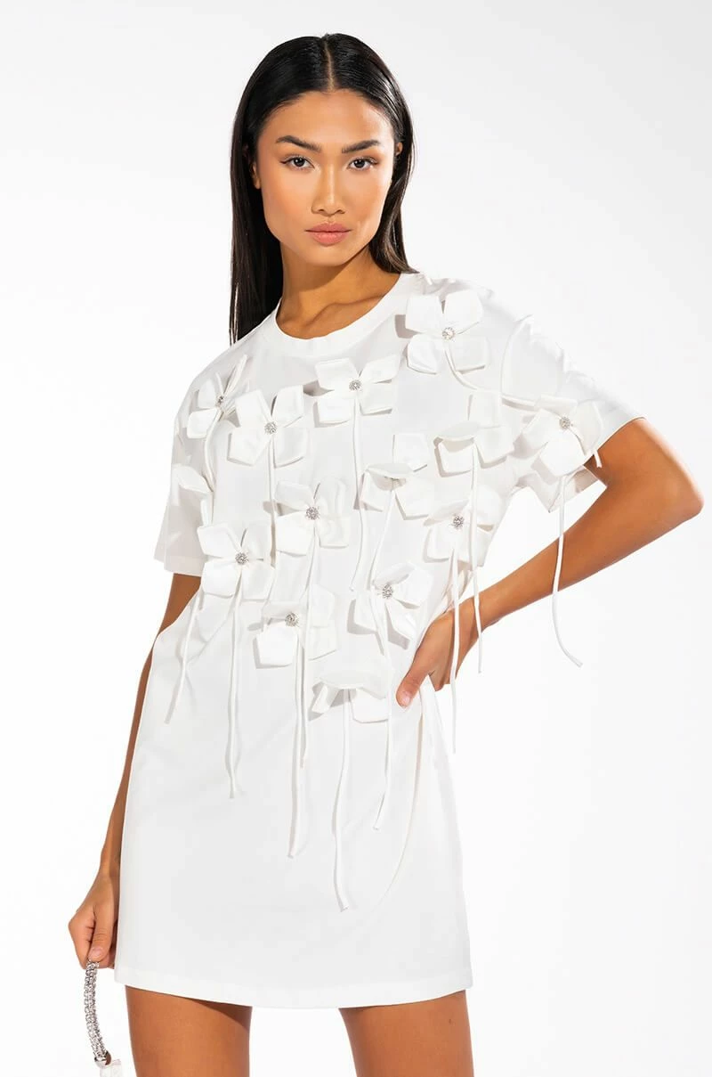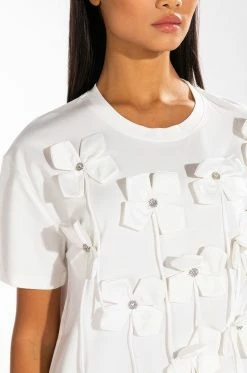 Spring has sprung with The AKIRA Label Flower Power Tshirt! This soft and stretchy top features a crew neckline, boxy short sleeves, an oversized fit, and 3D flower detailing with satiny petals and stems and rhinestone centers.