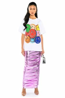 The Fun For You Tshirt is an oversized stretch cotton graphic t-shirt featuring a crew neckline, boxy short sleeves, and smiley face graphic print patterning. Complete with rhinestone stud detailing and silver metallic accents.