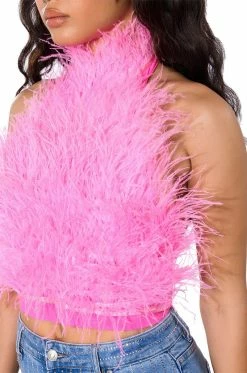 The AKIRA Label Genuine Ostrich Feather Sleeveless Cropped Halter Blouse is made from a stretchy mesh fabrication and features layered opulent ostrich feathers throughout, a halter neckline with back button detailing, a sleeveless silhouette, an elastic hem, a sexy open back, and a cropped length. Complete with an exposed back zipper closure. Pair this piece with satin bottoms and pumps to complete your look.