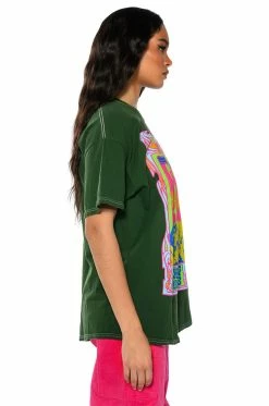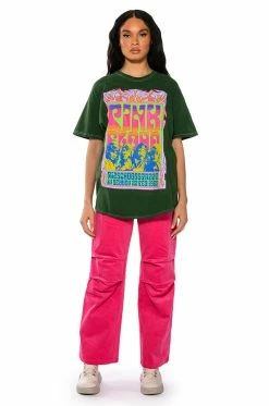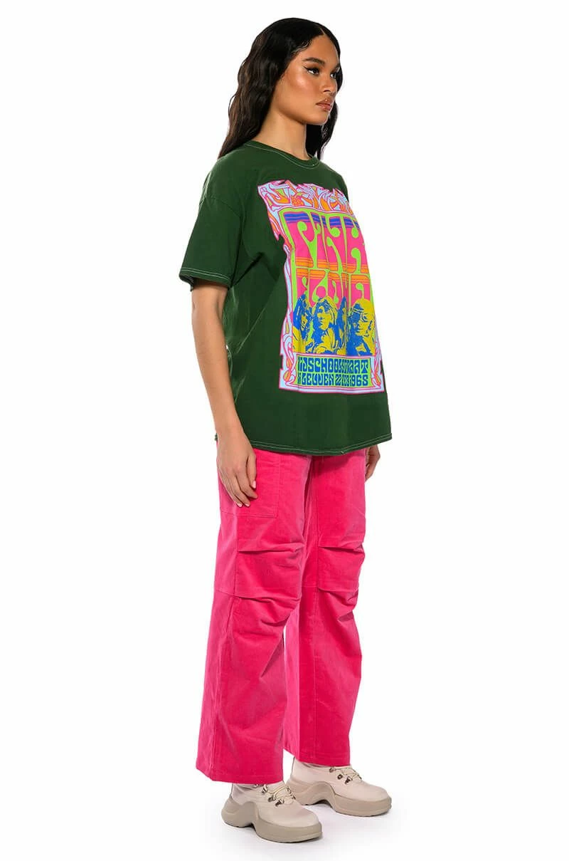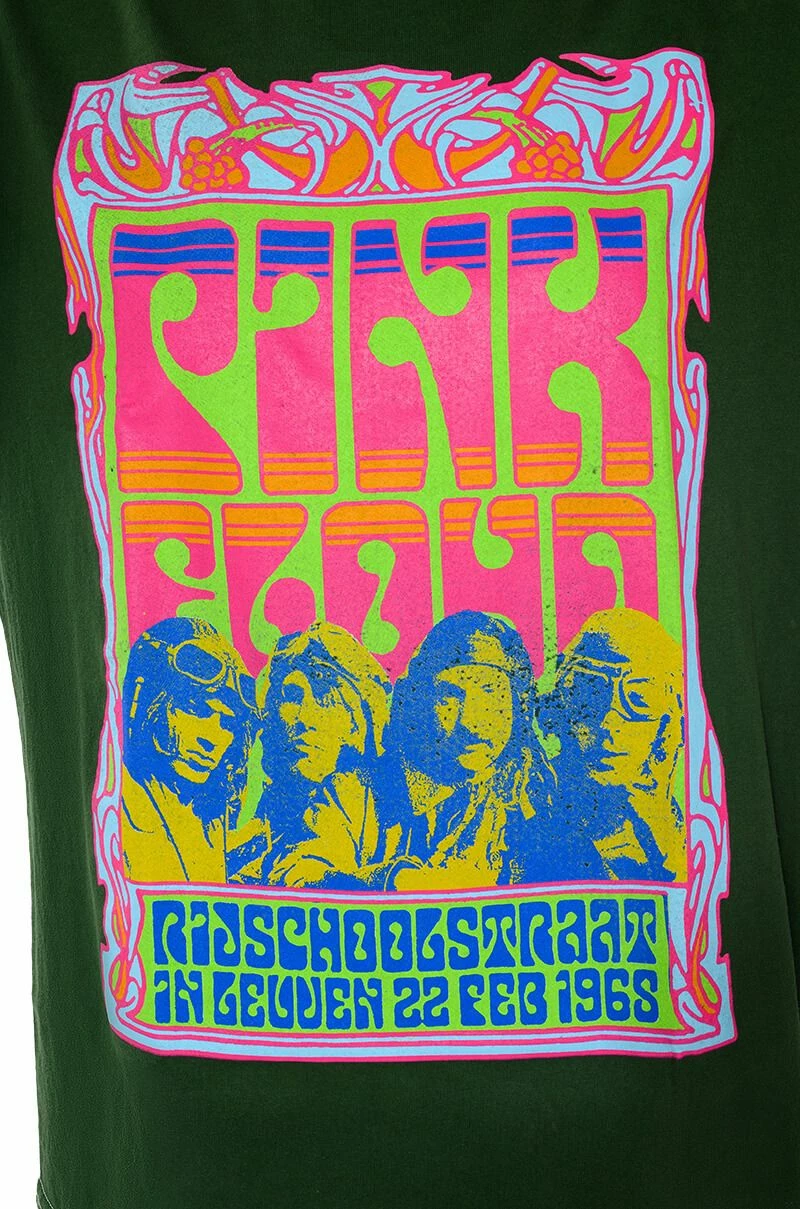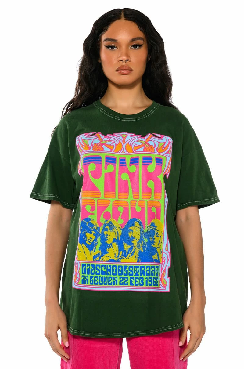 The Green Pink Floyd Pigment Dyed Tshirt features a crew neckline, short sleeves, an oversized silhouette, and contrast seams. Complete with a psychedelic and vibrant art nouveau inspired vintage graphic print, displaying an image of the band and concert details. Pair with distressed relaxed denim jeans and loafers.