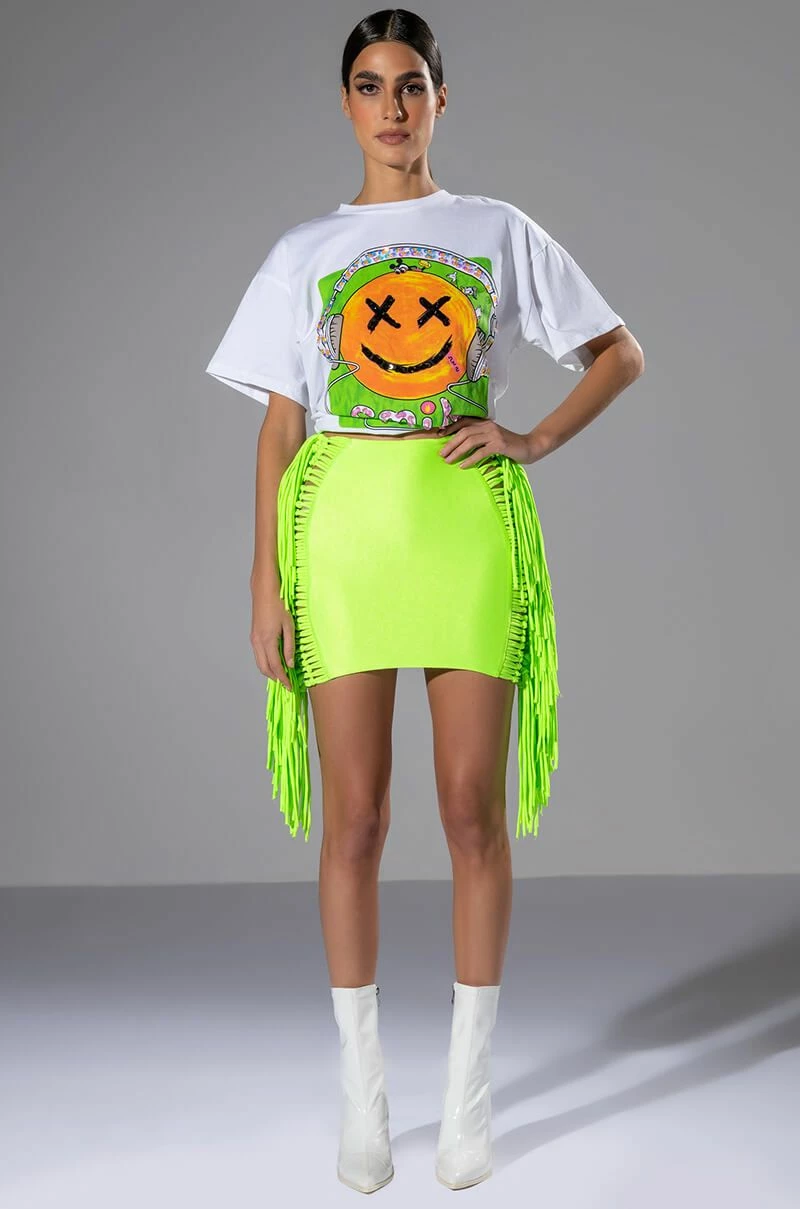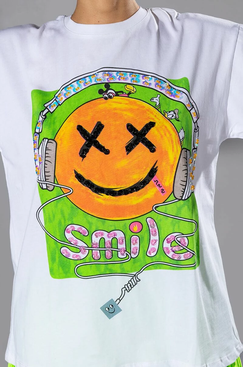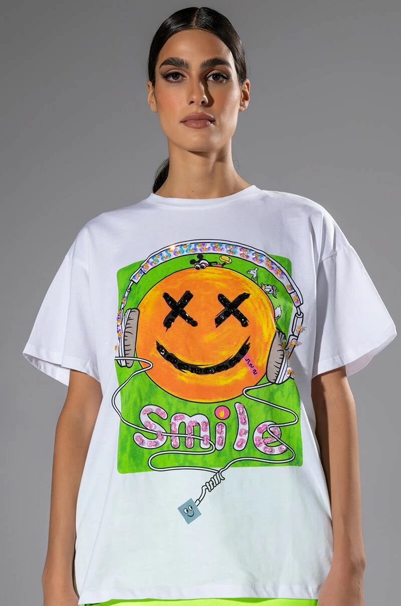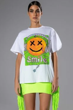 The Happy Face Graphic TShirt features a cozy cotton base, a crew neckline, short sleeves, an oversized silhouette, and a smiley face graphic detail. Complete with sequin detailing, โsmile,โ text print, and a pull-on silhouette. Style this graphic piece with leggings and combat boots to complete your look.