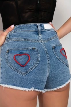 Weโre crushing on The AKIRA Label Heart Eyes Pocket Detail Mid Rise Denim Short. These denim bottoms feature a mid rise waist, a classic zip button closure, raw hem detailing, and cutout heart pocket detailing on the rear. Complete with a functional five pocket design, working belt loops, and silver metallic hardware. Style with your fave graphic crop tops and sweet slip on mules.
