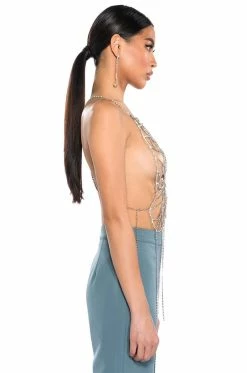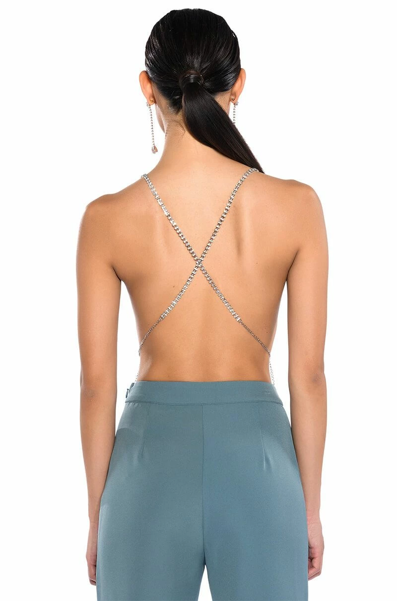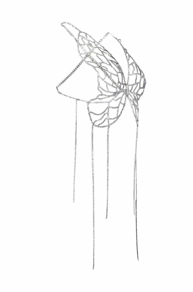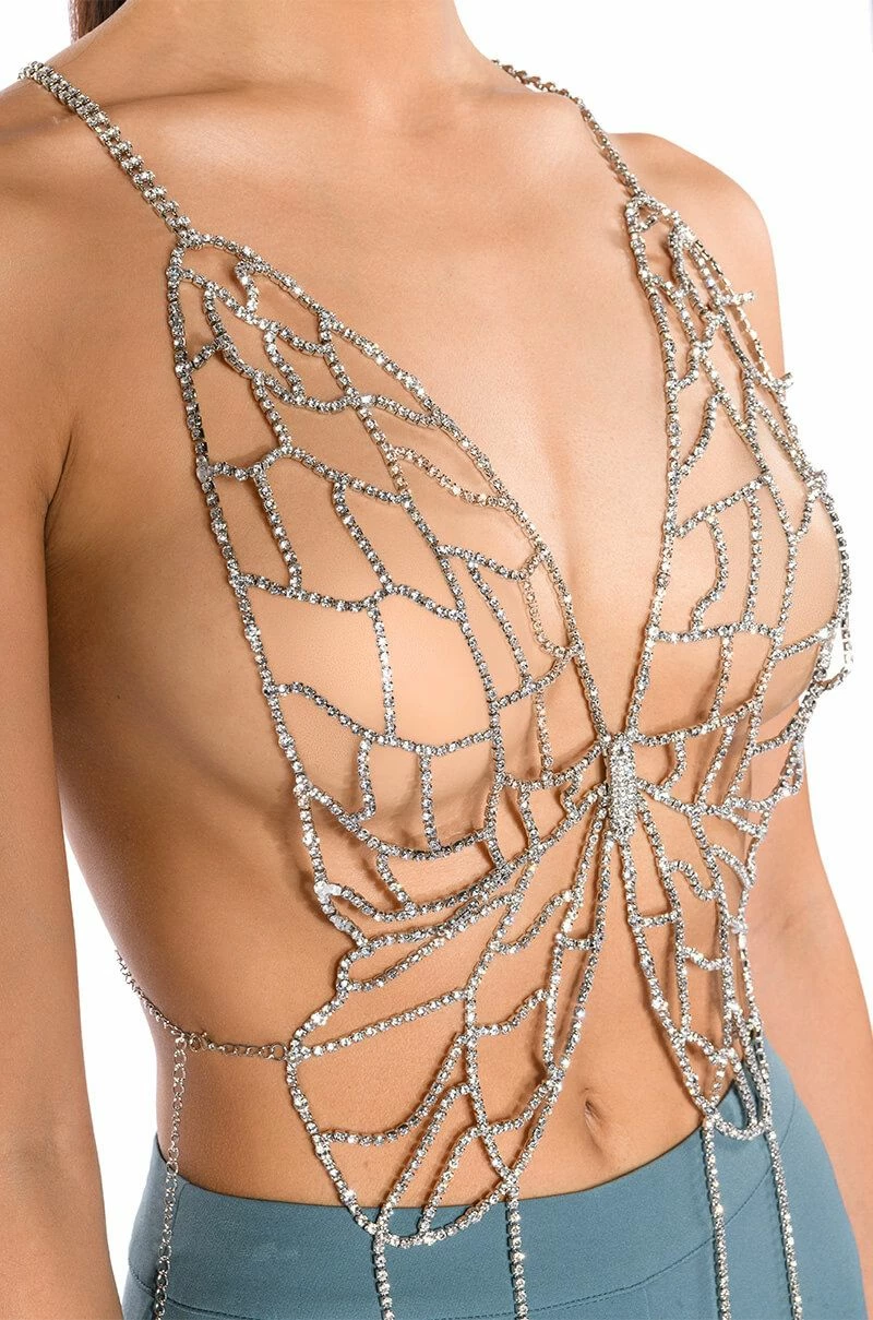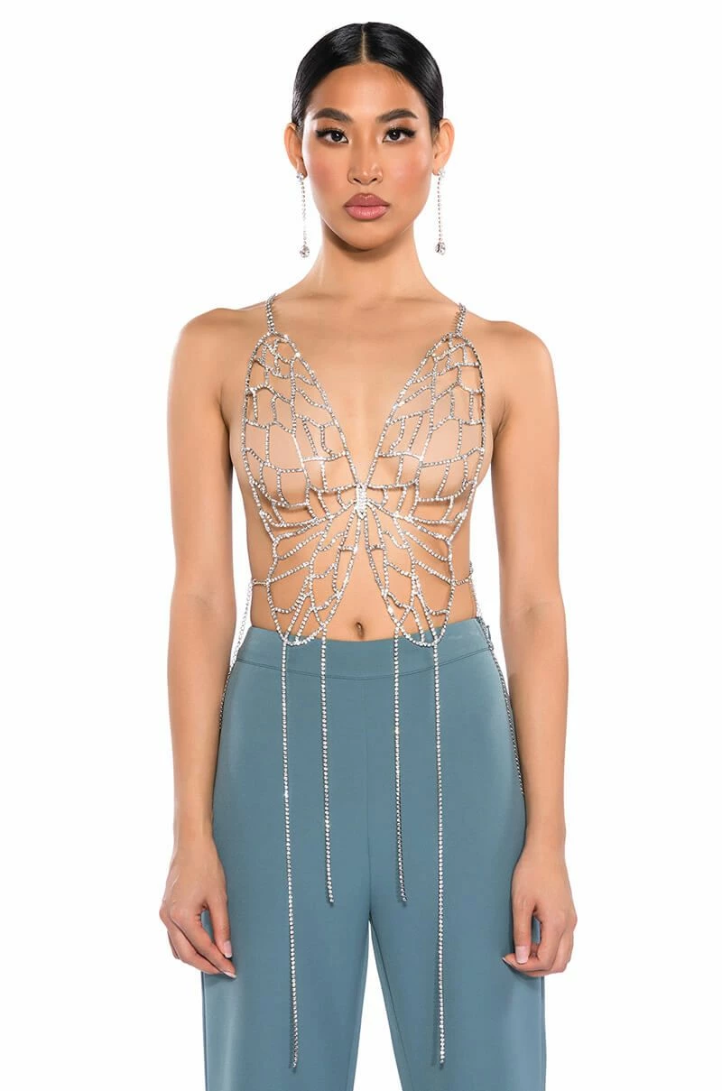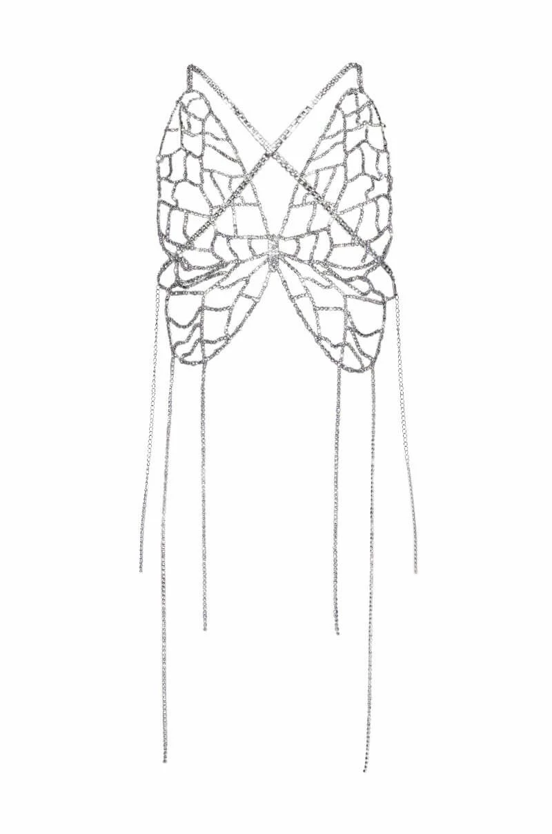 Hold me tight, but don’t hold me down. Stay fly with The AKIRA Label Hold Me Rhinestone Bra Top. This unlined rhinestone link piece features a halter neck design, a butterfly-inspired base, a cropped silhouette, and delicate dangling rhinestone link detailing. Complete with a back strap and dual lobster claw closures at the neck and back.