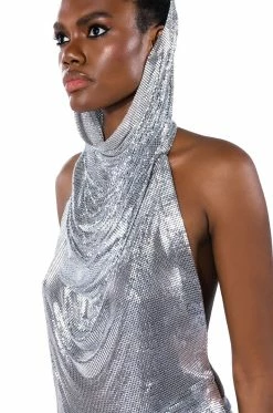 Make your dreams reality in The AKIRA Label In My Mind High Sine Hooded Chainmail Top. This metallic chainmail piece features a sleeveless silhouette, a cowl neckline, a waist length cut, and a sensual backless design. Complete with an elegantly draped attached hood, a chain link back strap, and a lobster claw clasp closure. Pair with distressed denim and pointy toe pumps for a complete look.