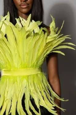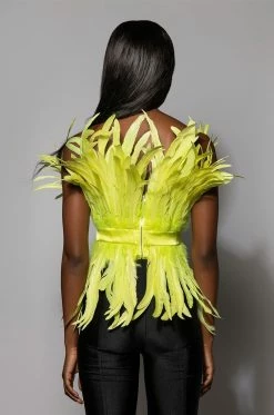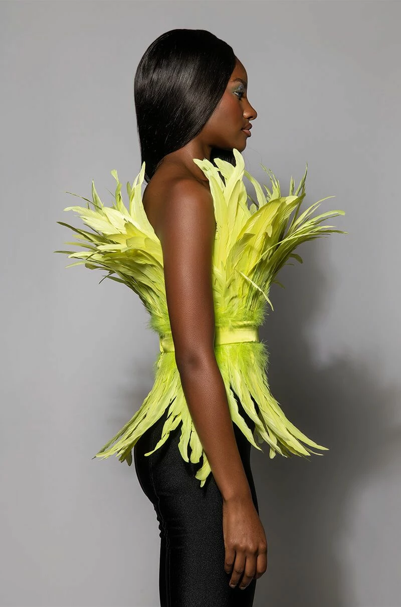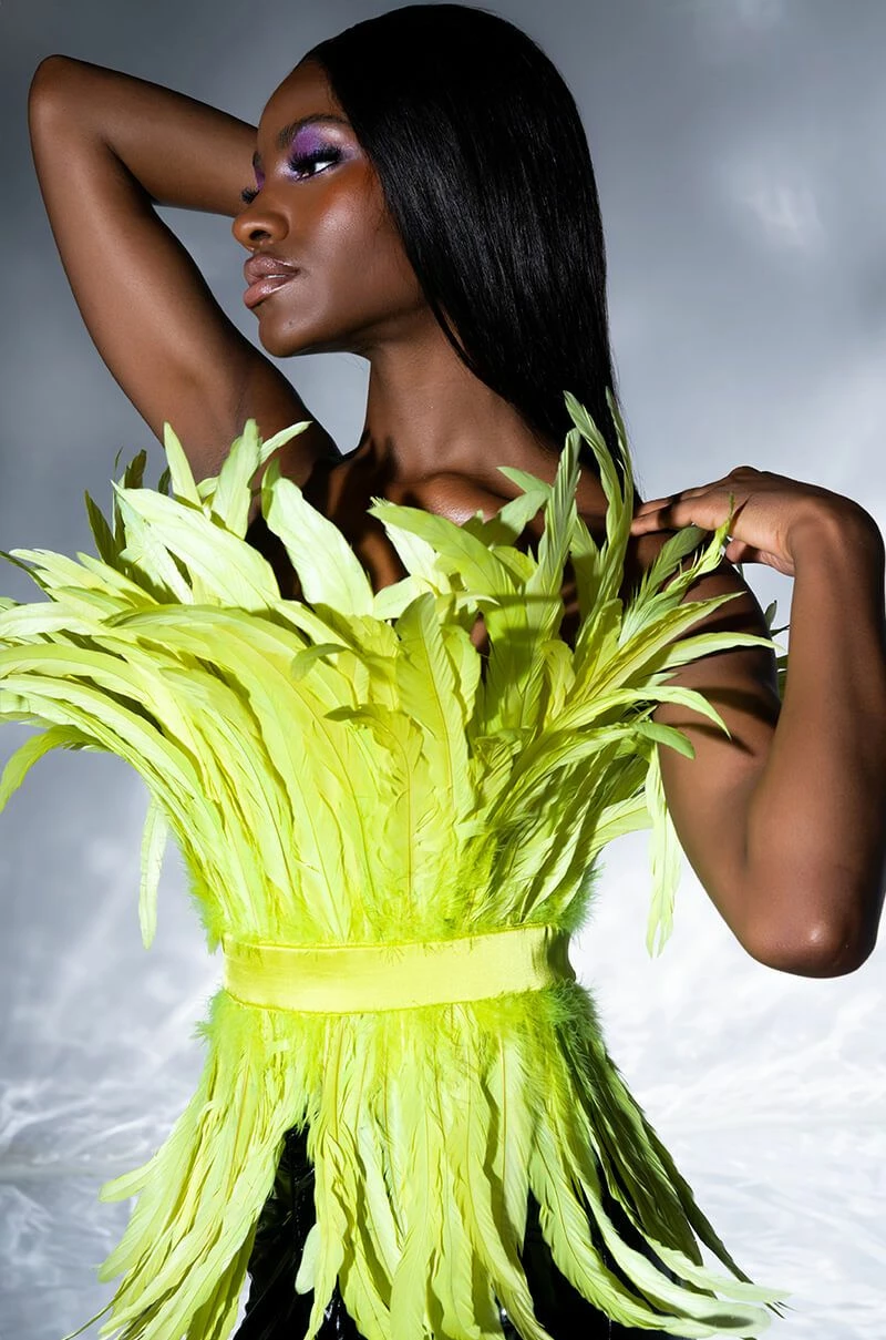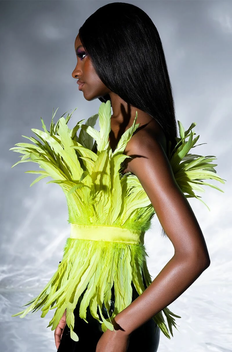 The AKIRA Label Isla Statement Strapless Feather Top is a glamorous going out top featuring a cropped satin base, a strapless silhouette, opulent feathers throughout, an exposed back zipper closure, and a waist-cinching satin ribbon. Pair this piece with straight leg denim and pumps to complete your look.