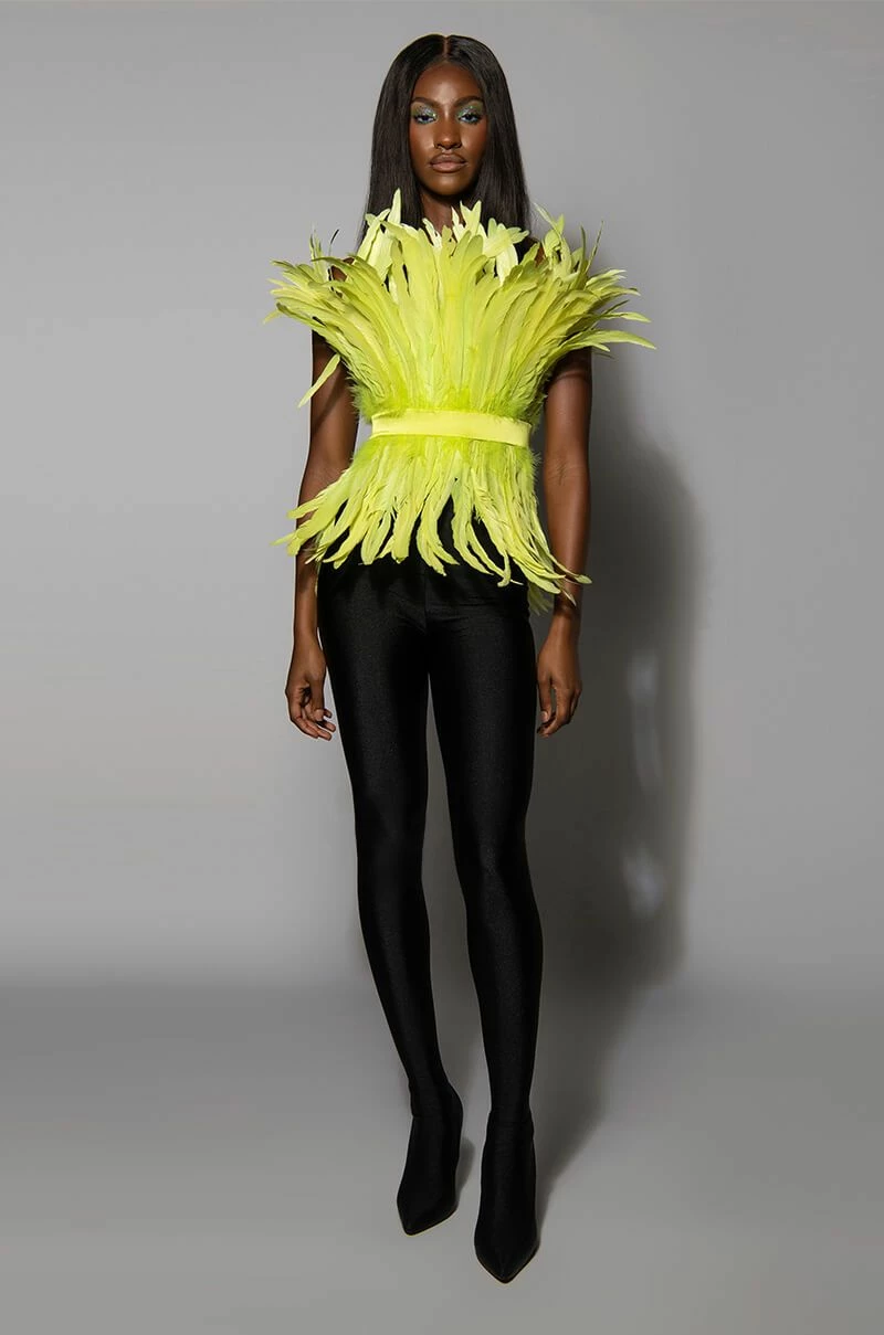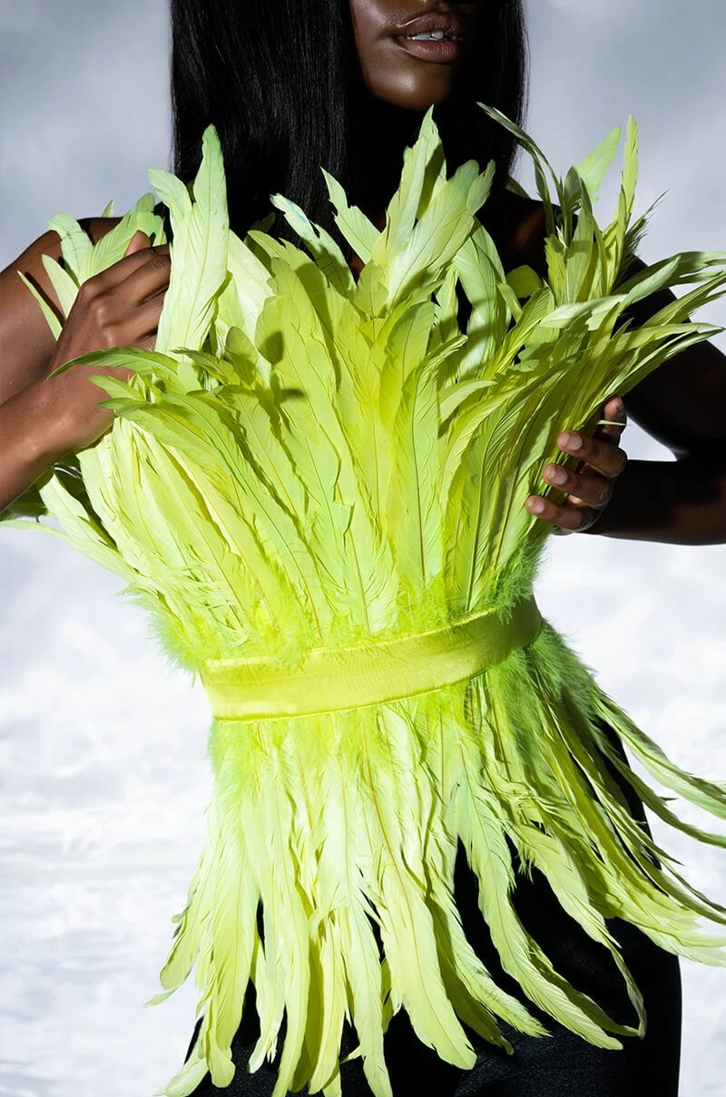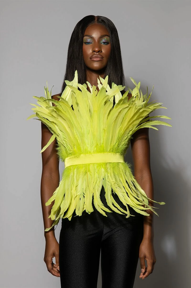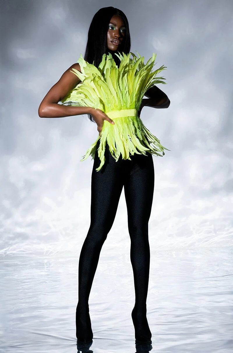 The AKIRA Label Isla Statement Strapless Feather Top is a glamorous going out top featuring a cropped satin base, a strapless silhouette, opulent feathers throughout, an exposed back zipper closure, and a waist-cinching satin ribbon. Pair this piece with straight leg denim and pumps to complete your look.