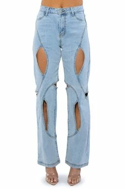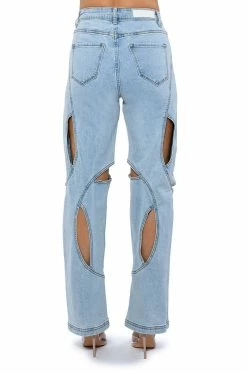 The AKIRA Label Jump Around Cutout Relaxed Fit Jeans are a unique high-waisted pant featuring a denim fabrication, working belt loops, functional back pockets, and a straight leg silhouette. Complete with a classic zip button closure, cross front seams, vented knee slits, and dual vertical cut outs at the front and back high. Pair these pants with a cropped tee and heeled booties for an effortless look!