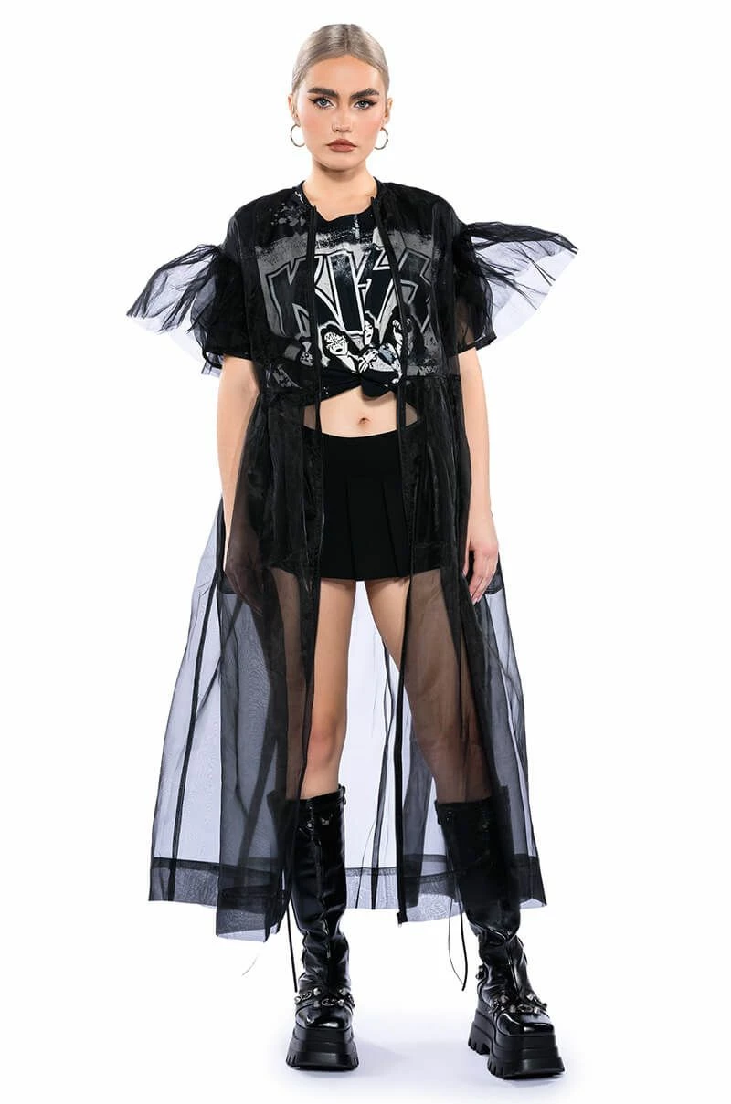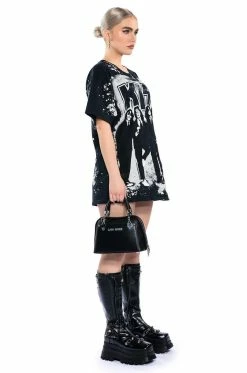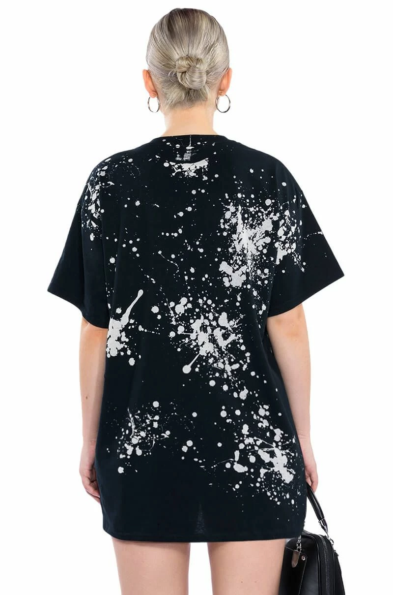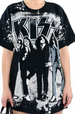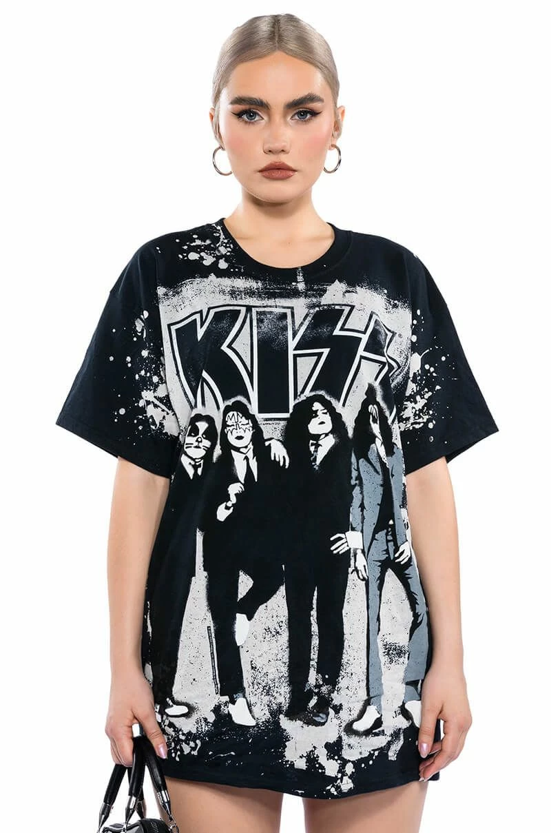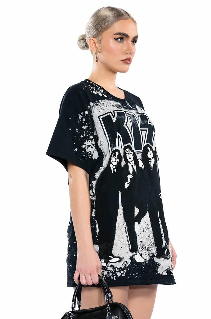 The Kiss Short Sleeve Graphic Band Tee features a crew neckline, short sleeves, and an oversized silhouette. Complete with an allover splatter spray paint print, the band’s name, and an illustration of the band. Pair with distressed relaxed denim jeans and loafers.