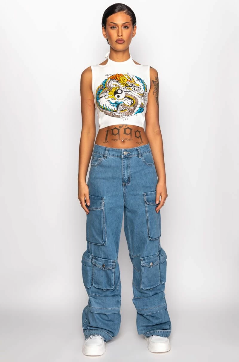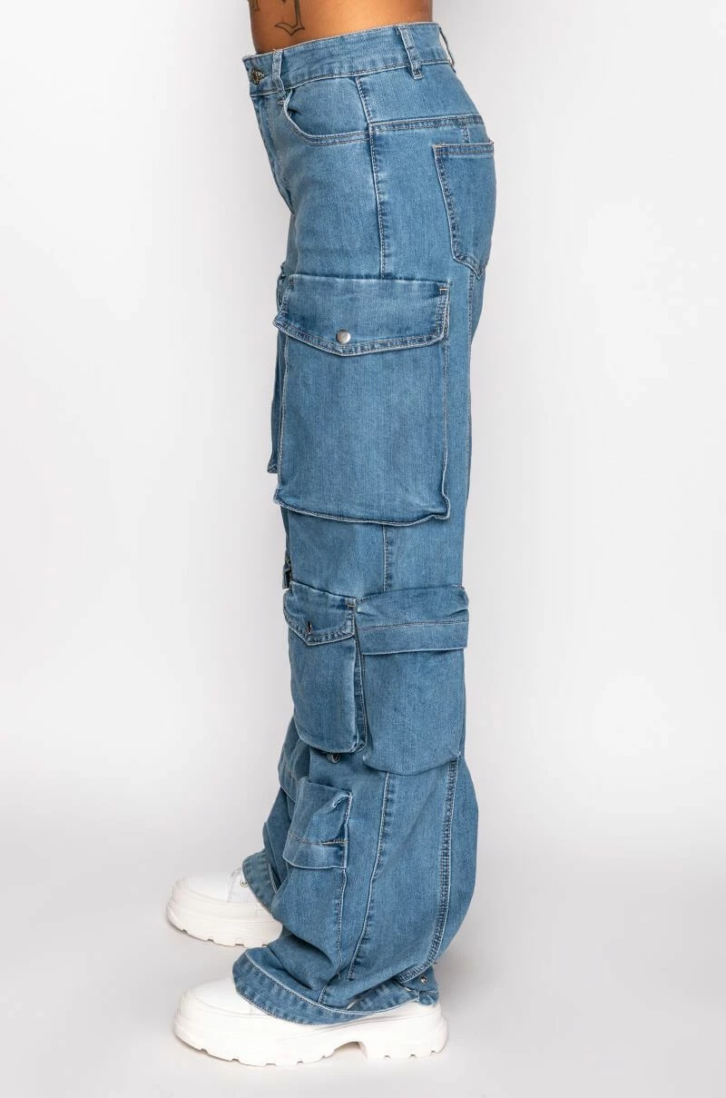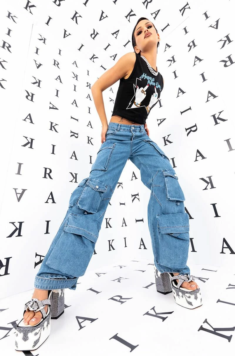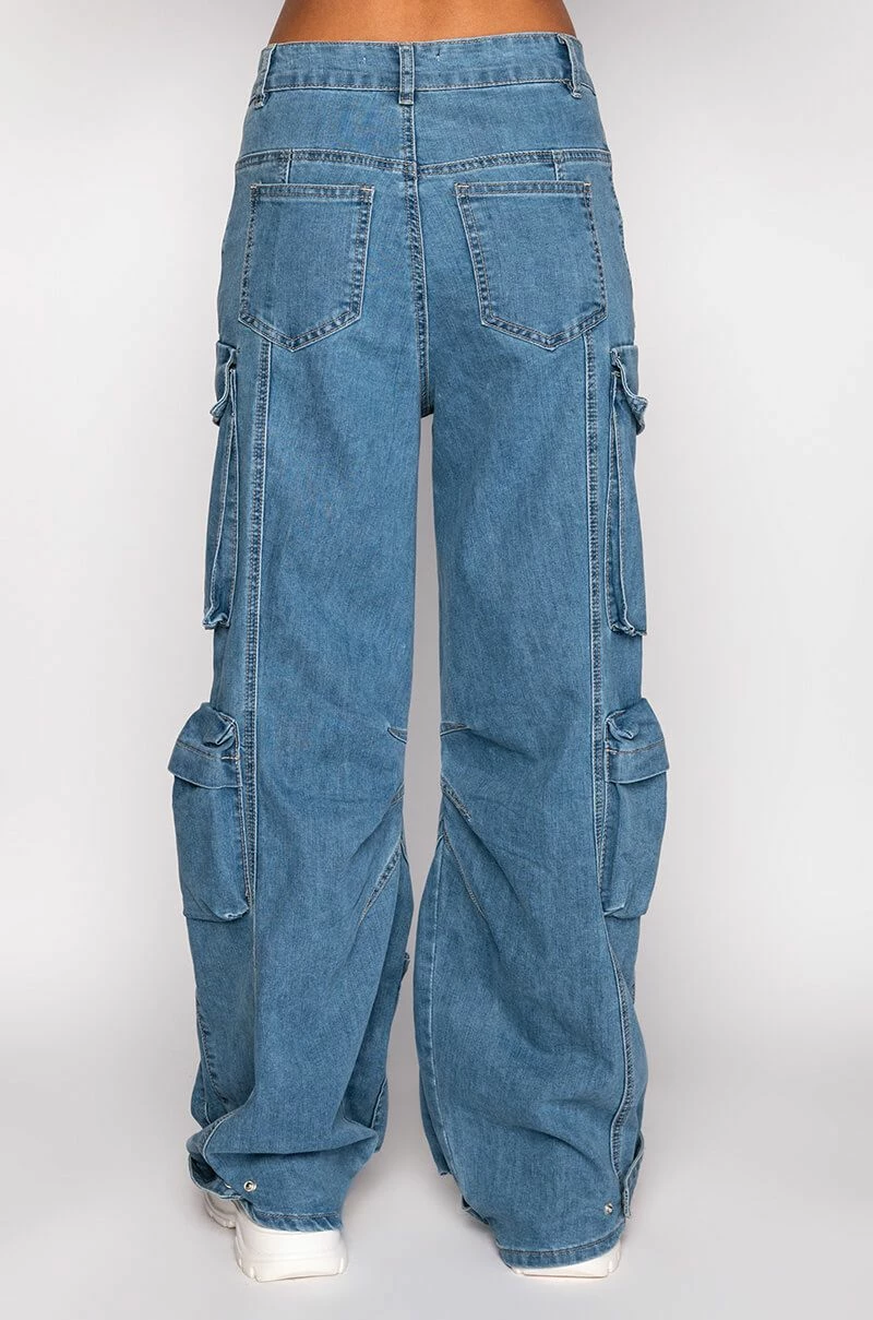 Weโre feeling the island vibes in The AKIRA Label La Isla Cargo Jeans! These laid-back bottoms are made from a structured denim fabrication and feature a high rise waist, belt loops, a classic 5-pocket design, large cargo snap button side pockets, a wide leg silhouette, triangular stitching on the inner legs, and denim snap button ankle cinchers. Complete with a classic zip button closure.