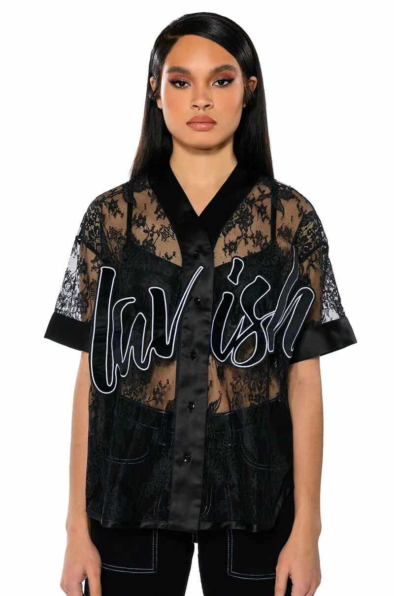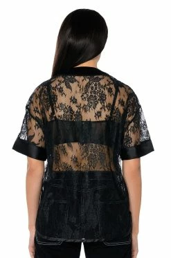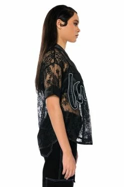 The AKIRA Label Lavish Floral Lace Jersey is made from a sheer floral lace fabrication and features a boxy silhouette, short sleeves, satin trim detailing, a rounded hem, and button down front closures. Compete with large front “Lavish” suede patch text detailing.