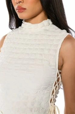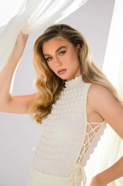 The AKIRA Label Little Miss Attitude Bodysuit features a textured unlined popcorn base, a mock neckline, and a sleeveless silhouette. Complete with lace up side detailing, a smooth, a poly blend cheeky bottom, and a snap gusset closure. Pair with the matching bottoms, The AKIRA Label Little Miss Attitude Textured Mini Skirt and knee-high boots for that hot girl look!