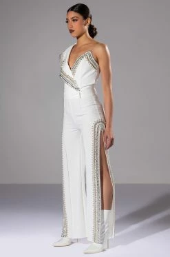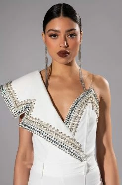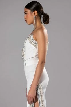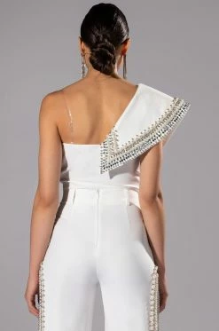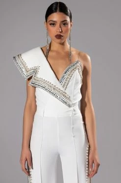 All we need are pearls, rhinestones, and studs… The AKIRA Label Luxurious Top is exactly what we’ve been waiting for! This bodysuit top features a lightweight, and smooth fabrication, an off-the-shoulder design, and a mesh bottom with snap gusset closure. Complete with a deep V-neckline, boning for structure, 3-D pearls, rhinestones, and metallic beads embellishments, and a concealed side zipper closure. Pair this designer top with the coordinating The AKIRA Label Luxurious Pants With Side Slits for a sexy yet tailored look!