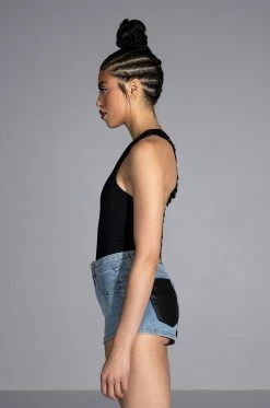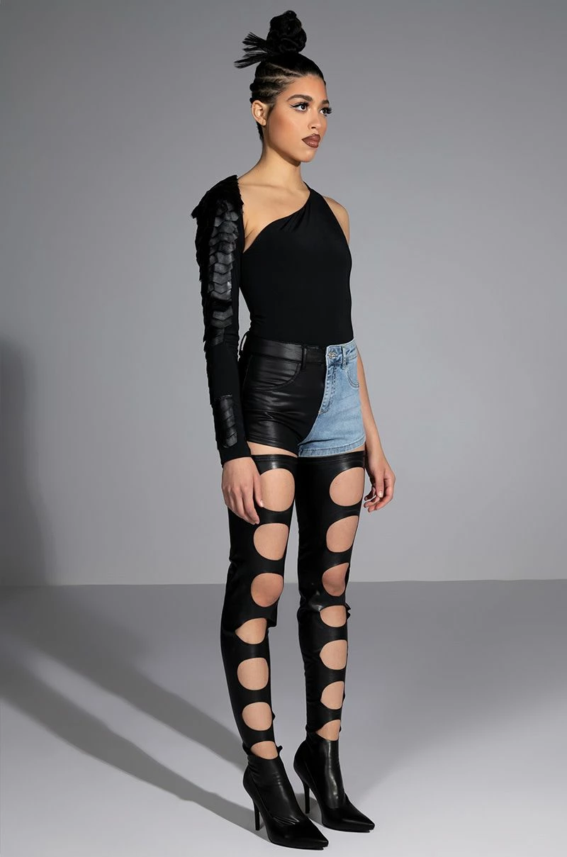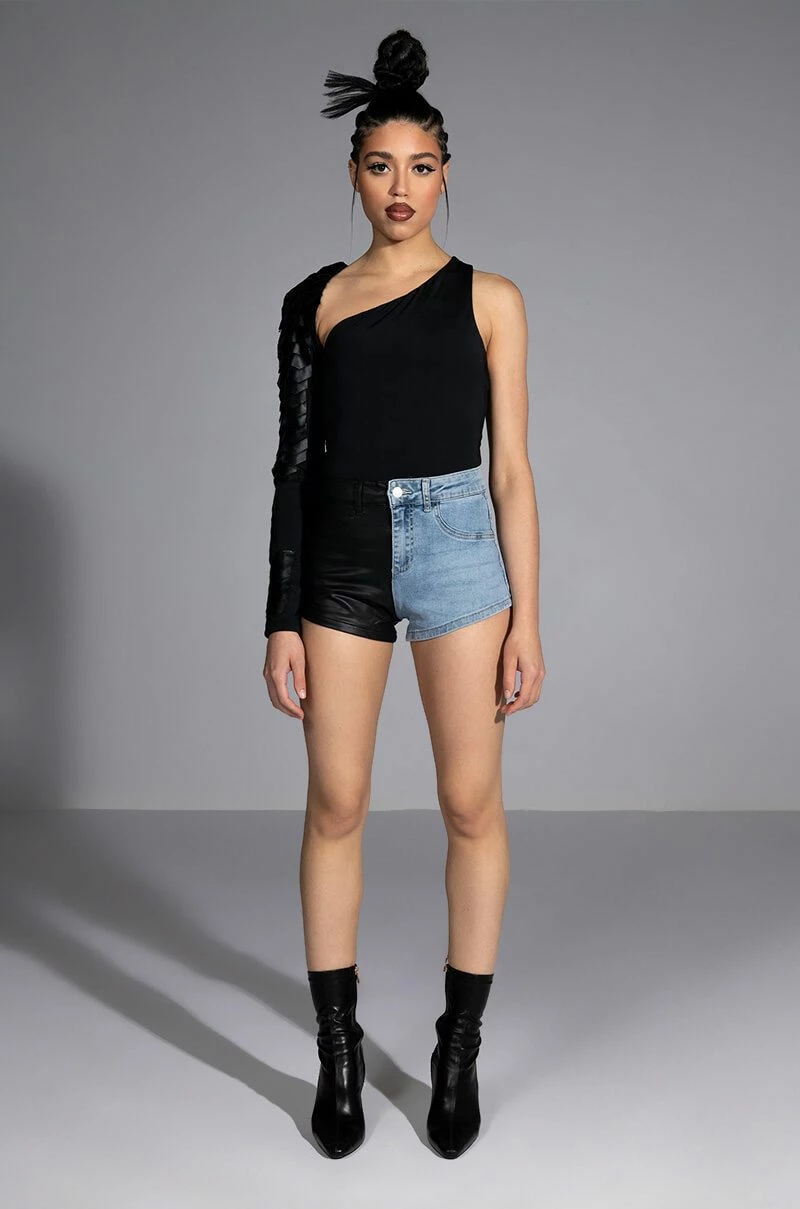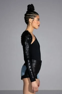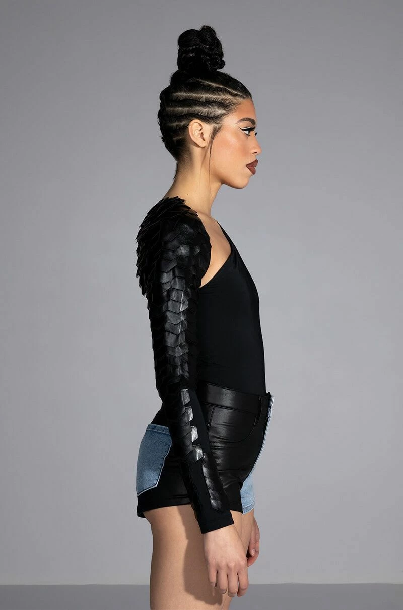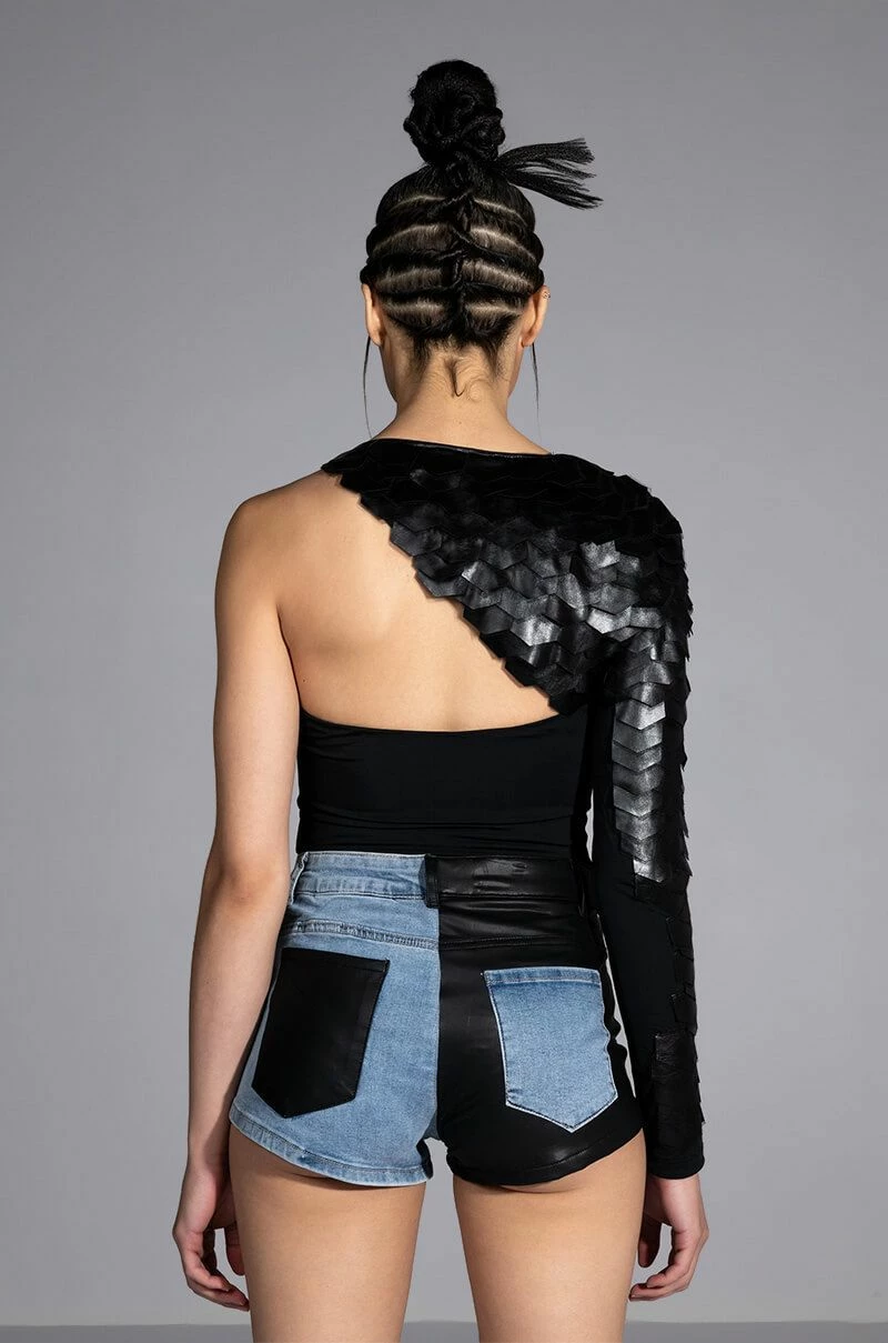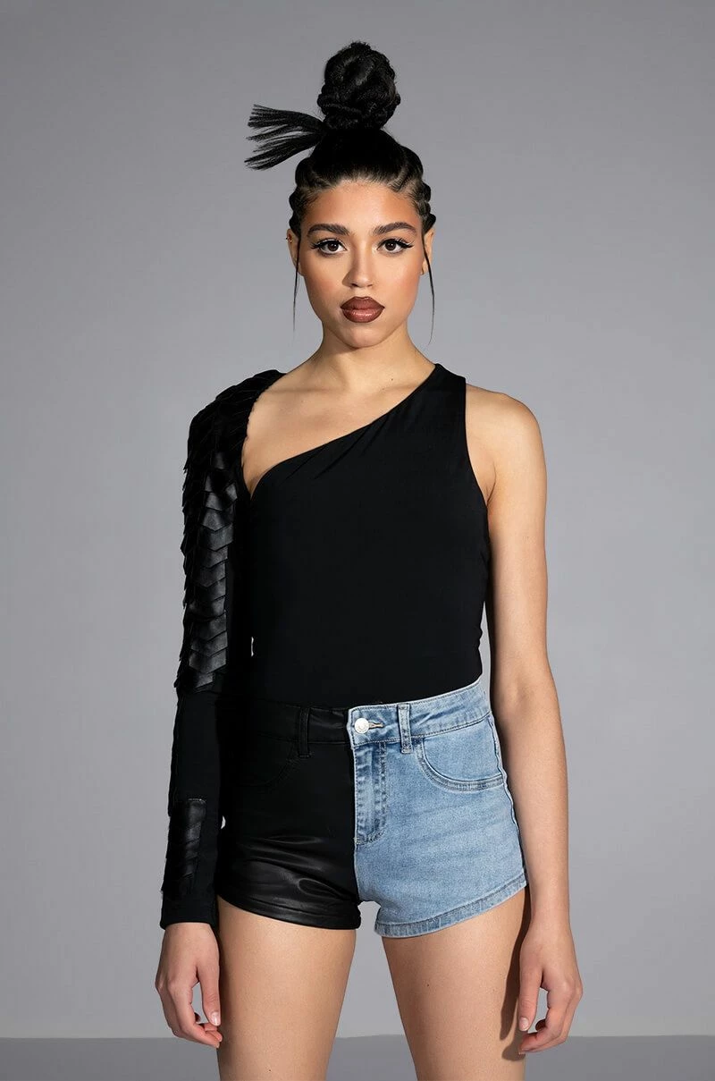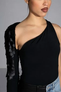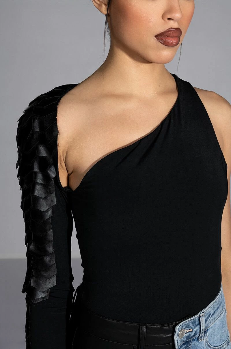 The AKIRA Label Made You Look Cold Shoulder One Sleeve Scale Bodysuit features a smooth, stretchy nylon base, a single long sleeve, an asymmetrical neckline, a cheeky silhouette, snap gusset closure, and geometric faux leather cutouts adorning the sleeve. Style with high waist pants and heeled booties to complete the look.