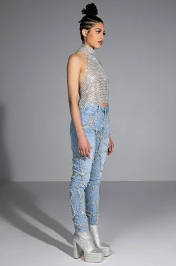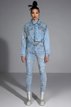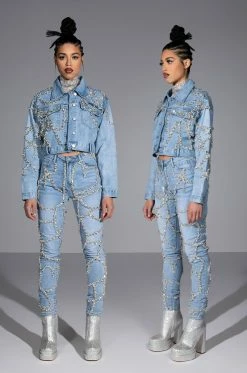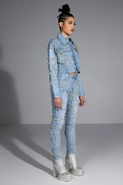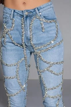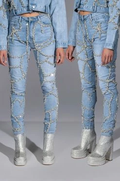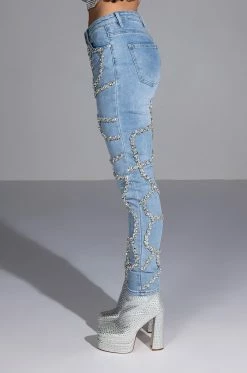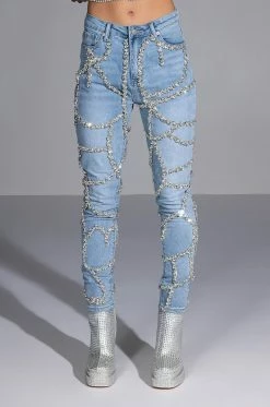 These pants are a dream come true! The AKIRA Label Make A Wish Rhinestone High Waisted Skinny Jean features a high waist rise, a lived-in stone wash, a classic five pocket design, a zipper fly button fasten, and vine-like cascading rhinestone link trim detailing. Pair with the coordinating AKIRA Label Make A Wish Rhinestone Embellished Denim Jacket for a complete look.