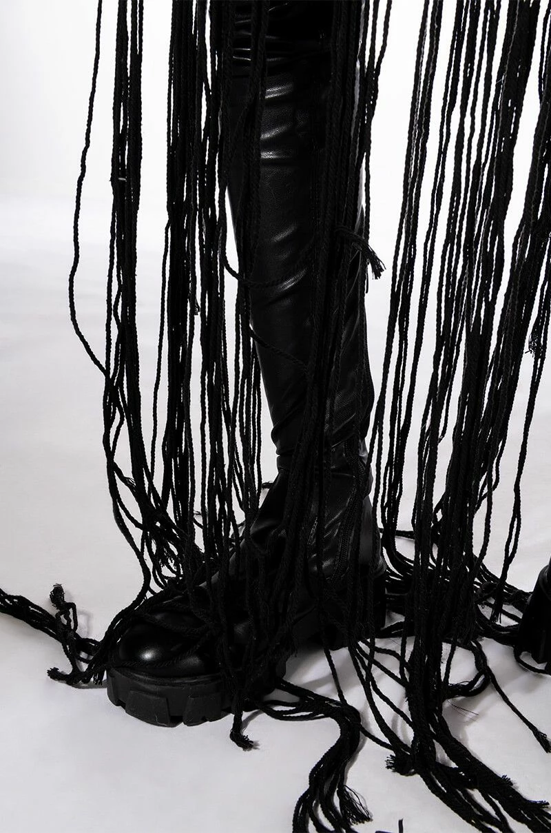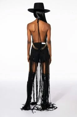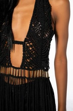 The AKIRA Label Marley Ultra Long Crochet Fringe Blouse is made from an unlined crochet base and features a tie halter with opaque rings, a plunging neckline with a crochet bar below the chest, a sleeveless silhouette, thin metal cylinder waist belt detailing, a sexy open back, and ultra long fringe trim. Complete with a tie back closure.