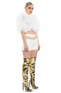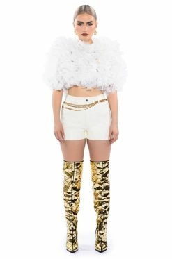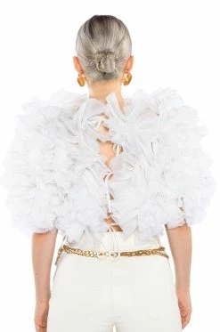 The AKIRA Label Must Be Dreaming Ruffle Crop Blouse is your dream come true. This flirty top features a sheer base, a ruffled fabrication, a crew neckline, cropped cut, and short ruffled sleeves, Complete with an exposed back and dual tie back closures. Complete your dreamy look with white shorts and strappy sandals.