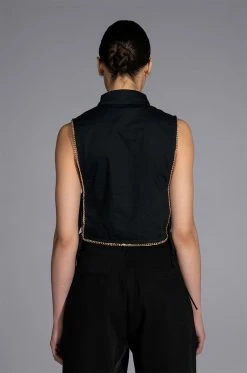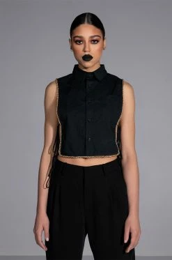 The AKIRA Label My Time Button Down Sleeveless Blouse is a cropped blouse featuring a structured cotton fabrication. a point collar design, a button down front placket, and open side detailing with dual tie up closure. Complete with luxurious faux gold chain link detailing. Style this shirt with a sleek pair of leggings.
