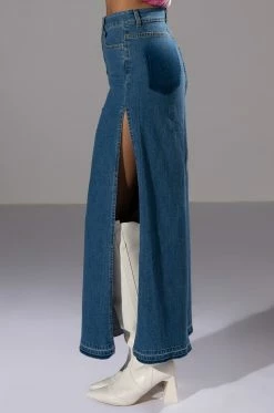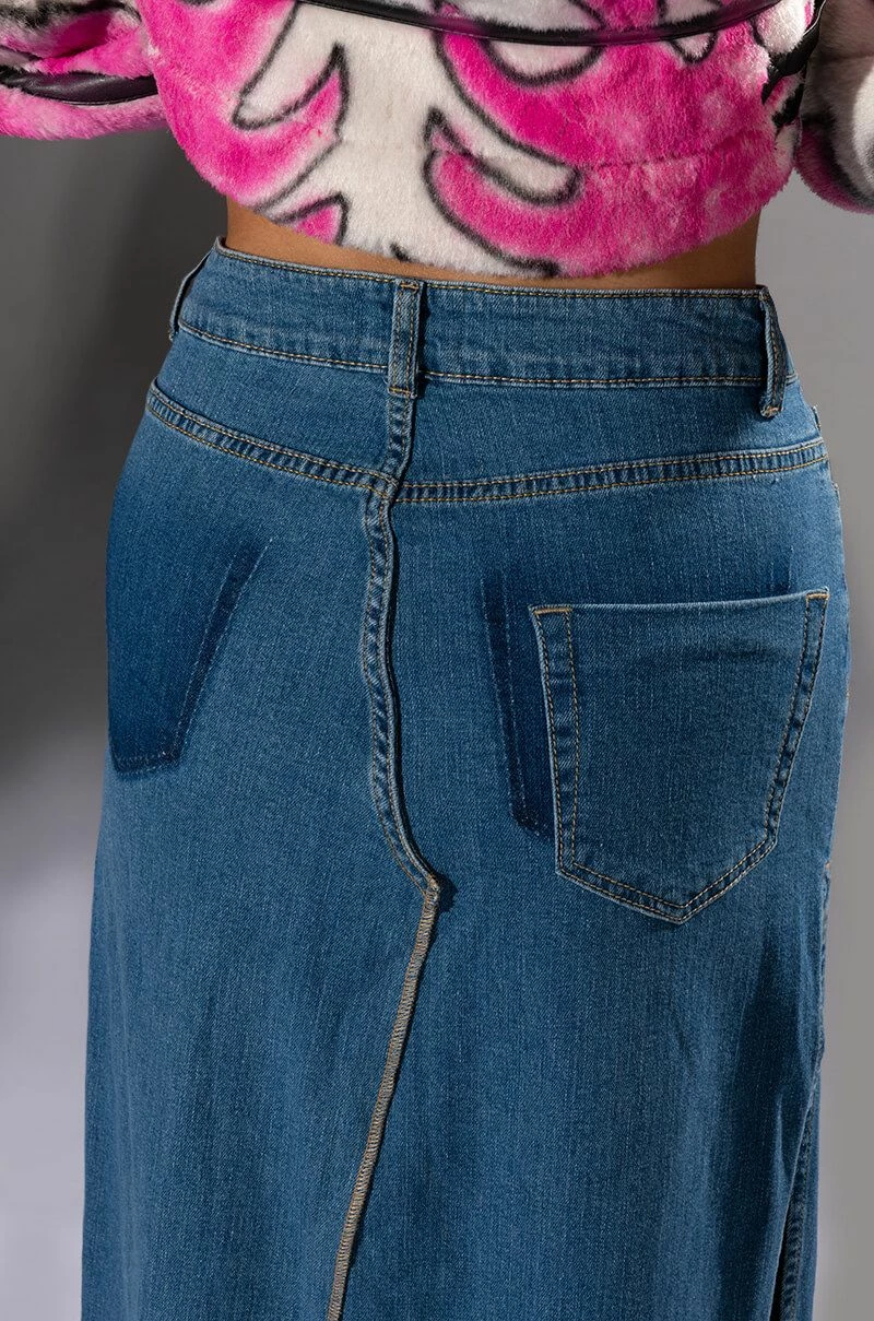 The Natalie Double Side Slit Denim Skirt is made from a denim fabrication and features a high rise waist, belt loops, one working back pocket design, high side slits, and a front button and zipper closure. Pair with a white cropped tee, square toe mules, and shades for an everyday look.