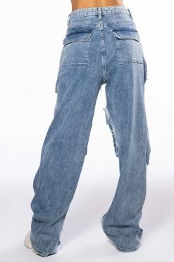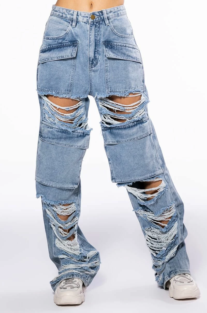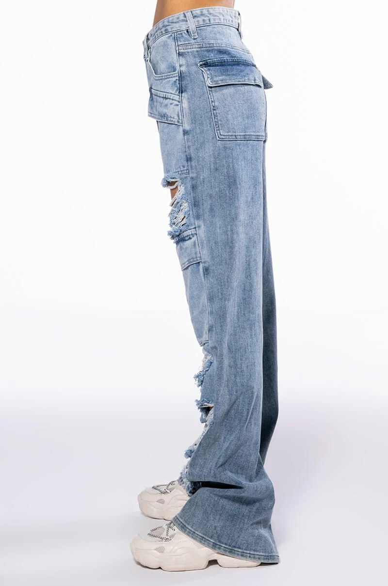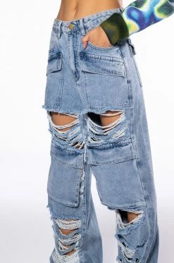 The AKIRA Label Never Stressed Distressed Relaxed Fit Jeans feature a high waist rise, an acid wash denim fabrication, classic front pockets, two sets of flap front cargo front pockets, flap front back pockets, a straight leg silhouette and a zip front button closure. Complete with distressed slash front detailing.