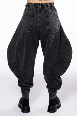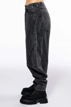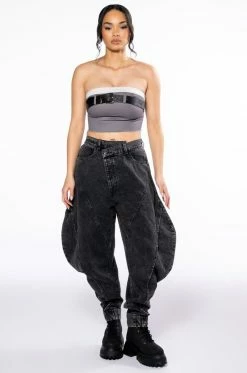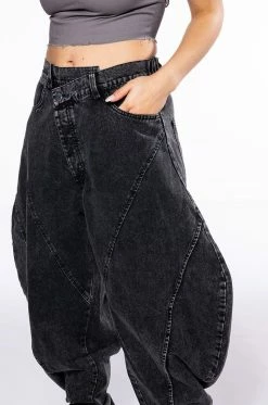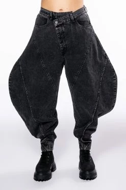 The AKIRA Label New You Abstract Volume Denim Pant is a unique jean bottom featuring an asymmetrical high rise waist, a wide elastic back waistband, and an ultra voluminous silhouette that tapers to skinny ankle hems. Complete with front and back pockets, diagonal seam detailing, functional belt loops, and a multi-button front closure.