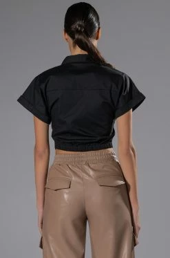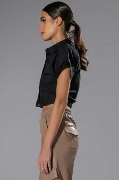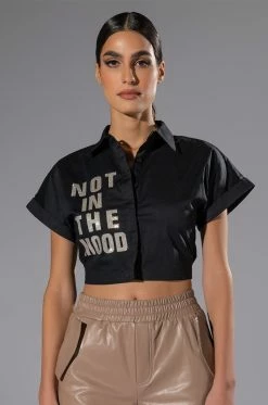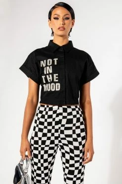 Let ‘em know how you feel with The AKIRA Label Not In The Mood Cropped Button Down Blouse. This cropped short sleeve blouse features a structured cotton fabrication. a point collar design, a button down front placket, and a cinched back elastic waistband. Complete with rhinestone text graphic detailing that reads “Not In The Mood,” at the front. Style this shirt with a sleek pair of legging boots.