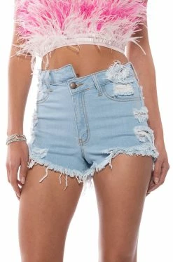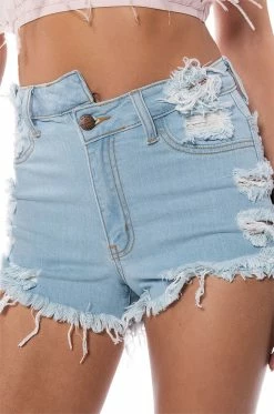 Pave the way this summer with The Opposite Direction High Waisted Denim Shorts! These shorts feature a stretch denim fabrication, an asymmetrical waistband, multiple side cut outs, distressed hem details, a high rise waist, working back pockets, and a classic button up and zipper closure. Style these shorts with a bodysuit and a pair of knee high stilettos for a sexy look!