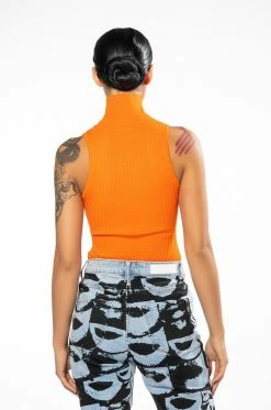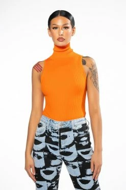 The PAXTON Sleeveless Turtleneck RIb Bodysuit is a chic sleeveless top featuring a ribbed knit fabrication, a turtleneck design, an attached thong bottom, and a snap gusset closure.
