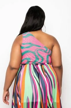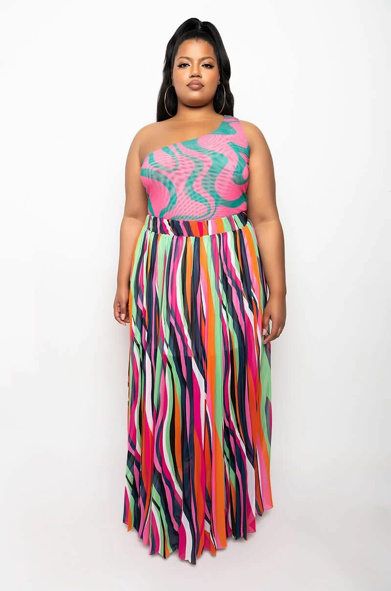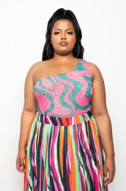 The Plus AKIRA Label Not That Deep One Shoulder Mesh Bodysuit is made from a sheer mesh fabrication and features a one shoulder silhouette, a multicolor abstract lines pattern, sexy bodycon fit, and snaps at the gusset. Style this piece with a pair of wide leg bottoms and mules for a funky fresh going-out look!