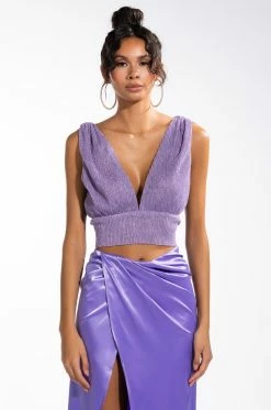 The AKIRA Label Poised Sleeveless V Neck Peplum Blouse is made from a semi-sheer, glittery pleated chiffon fabrication and features a plunging V neckline, sleeveless silhouette, cropped length, a peplum hem, and a tie back closure. Pair this glitzy piece with wide leg bottoms and mules to complete your shimmering going-out look!