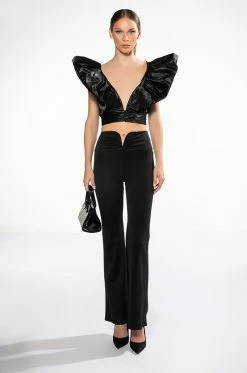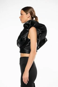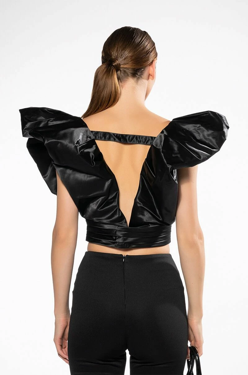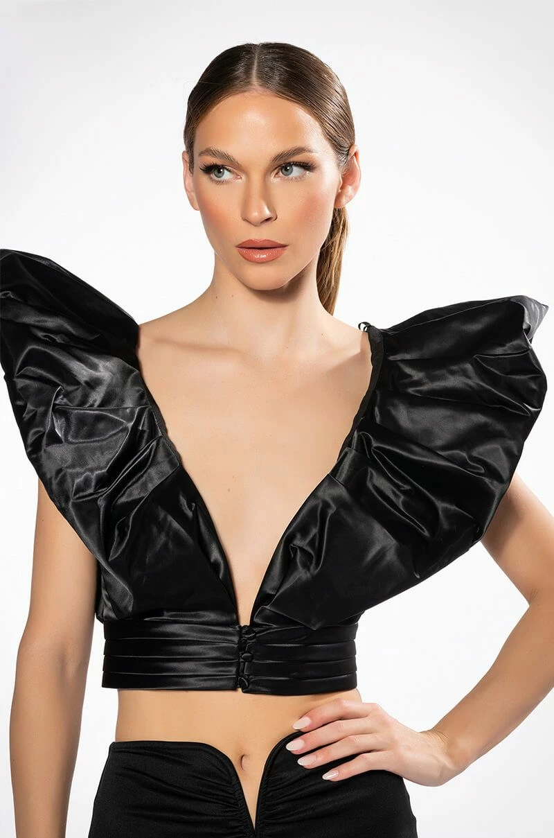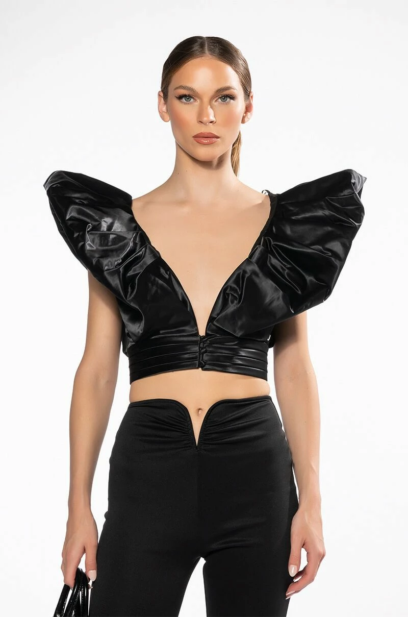 The AKIRA Label Puff Shoulder Bolero s a unique satin piece featuring a plunging neckline, a cumberbund-inspired waistline, covered button detailing, a cropped cut, and a coordinating v cut back. Complete with pleated puff shoulder detailing and a cross back strap. Pairs perfectly with tuxedo pants and patent pumps.