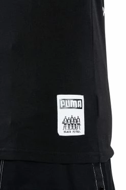 In collaboration with the Black Fives Foundation which researches, preserves, showcases, teaches, and honors the pre-NBA experience of African Americans in basketball, The PUMA Black Fives Barnstorming Tee is made from a cotton fabrication and is complete with a graffiti-style “BLACK FIVES PUMA” graphic and a sewn-on Black Fives PUMA patch on the front, a rounded neckline, major cities listed on the back with a stitched quote “Make history now™”, and short sleeves.