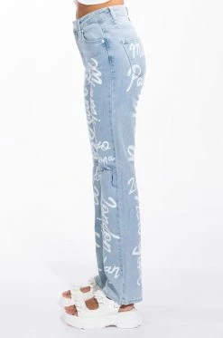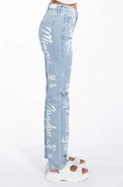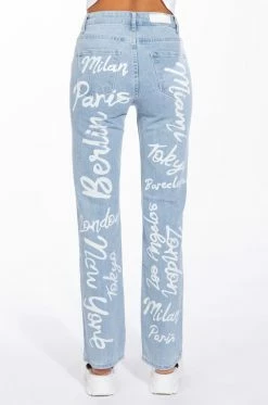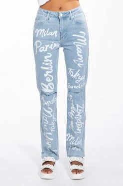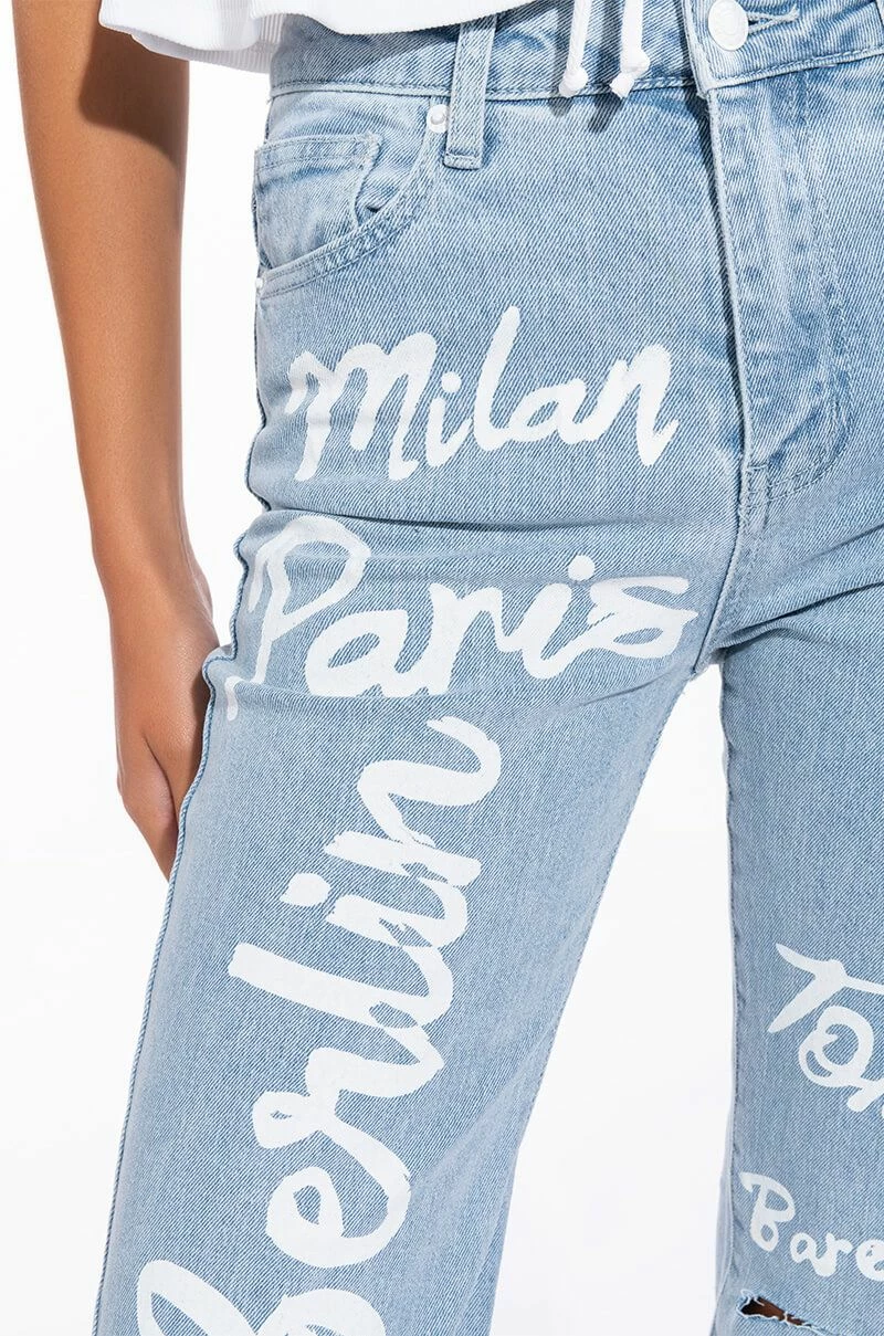 No passport necessary. Rep your dream vacation spots with The AKIRA Label Represent High Rise Straight Leg Jean. These high waisted denim bottoms feature a wide leg boyfriend style silhouette, slits on the knees, and glamorous travel destinations painted on throughout. Complete with a five pocket design and a classic button up and zipper closure. Style these pants with a baby tee and high top sneakers!